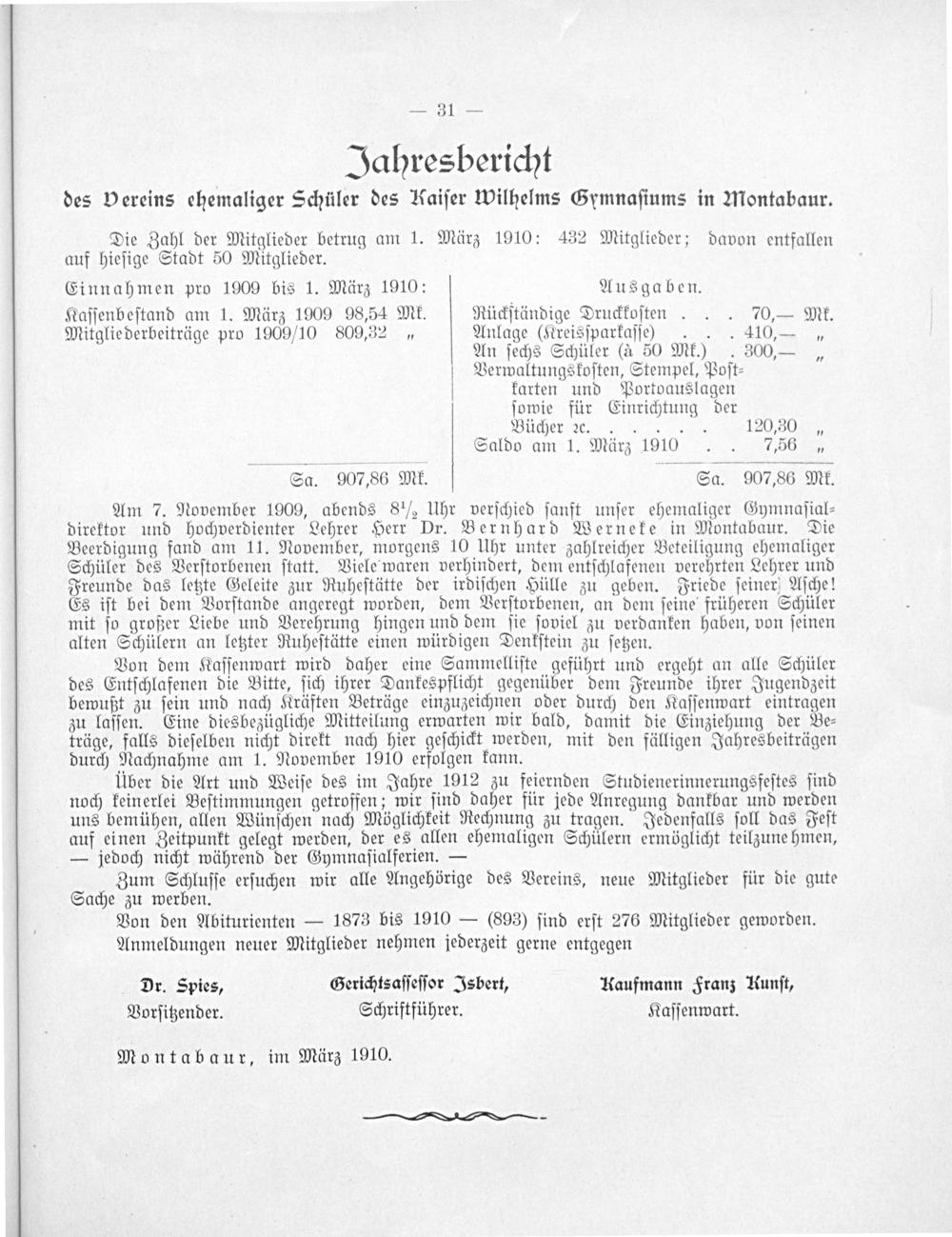 Jahresbericht des Vereins ehemaliger Schüler des Kaiſer Wilhelms Gymnaſiums in Montabaur.