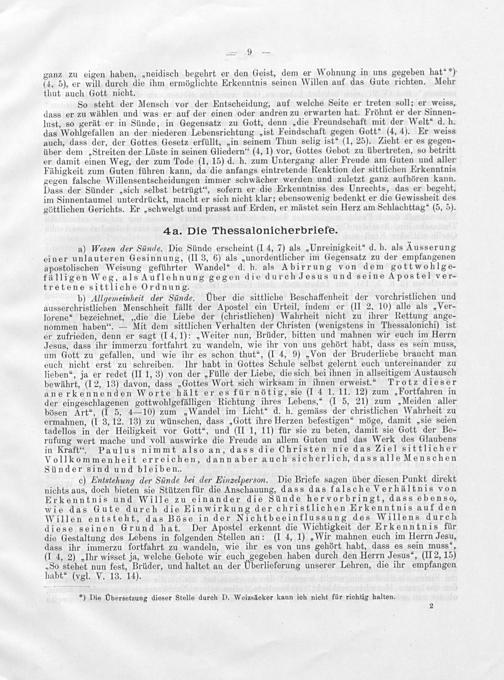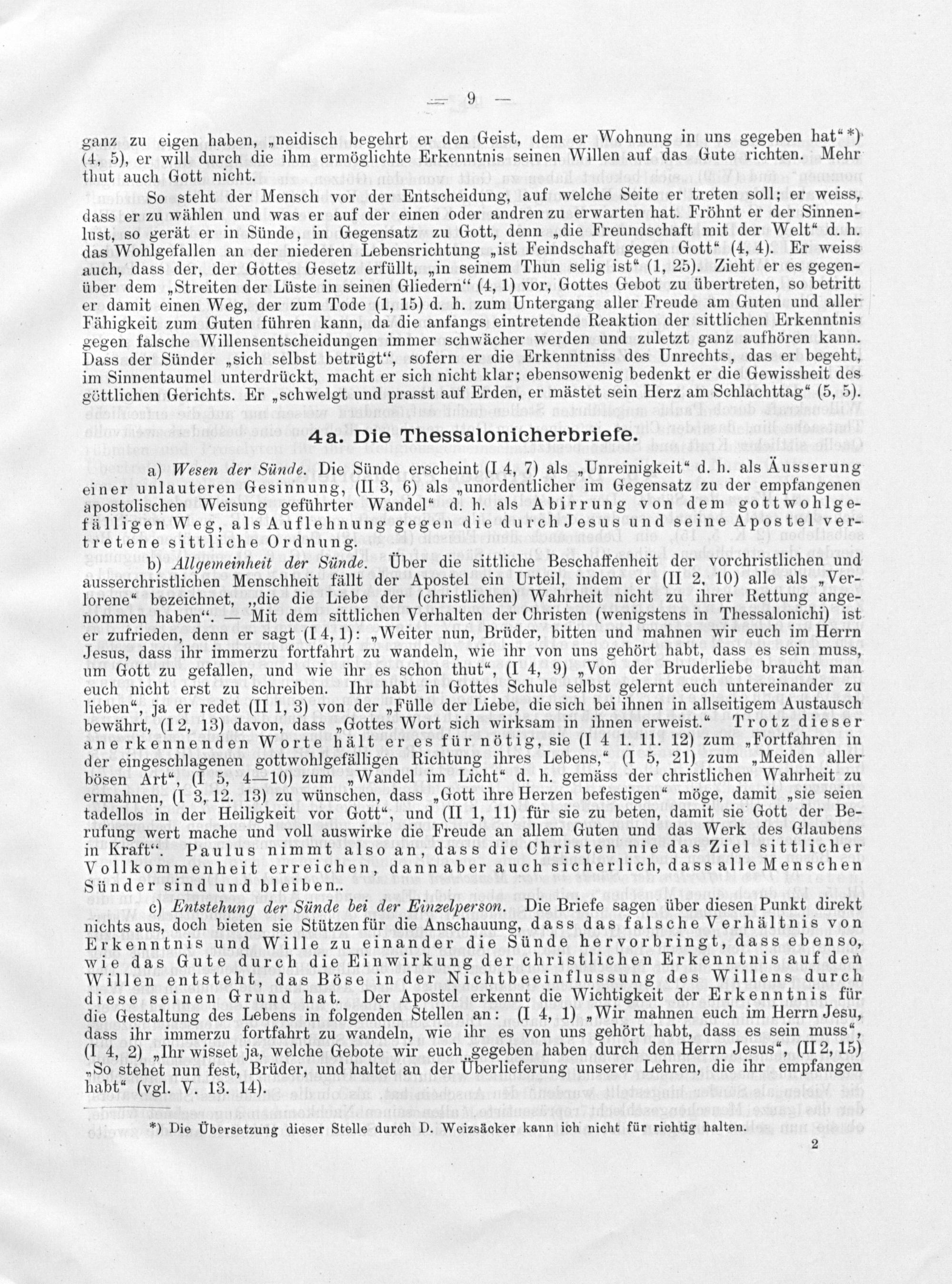 c) Entstehung der Sünde bei der Einzelperson. Die Briefe sagen über diesen Punkt direkt, nichts aus, doch bieten sie Stützen für die Anschauung, dass das falsche Verhältnis von Erkenntnis und Wille zu einander die Sünde hervorbringt, dass ebenso, wie das Gute durch die Einwirkung der christlichen Erkenntnis auf den Willen entsteht, das Böse in der Nichtbeeinflussung des Willens durch diese seinen Grund hat. Der Apostel erkennt die Wichtigkeit der Erkenntnis für die Gestaltung des Lebens in folgenden Stellen an:(I 4, 1)„Wir mahnen euch im Herrn Jesu, dass ihr immerzu fortfahrt zu wandeln, wie ihr es von uns gehört habt, dass es sein muss“, (1 4, 2)„Ihr wisset ja, welche Gebote wir euch gegeben haben durch den Herrn Jesus“,(II 2, 15) „So stehet nun fest, Brüder, und haltet an der Uberlieferung unserer Lehren, die ihr empfangen habt“(vgl. V. 13. 14).