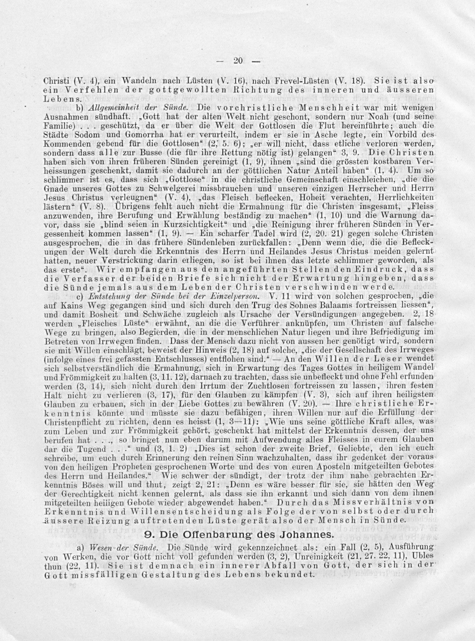 ebens. b) Allgemeinheit der Sünde. Die vorchristliche Menschheit war mit wenigen Ausnahmen sündhaft.„Gott hat der alten Welt nicht geschont, sondern nur Noah(und seine Familie)... geschützt, da er über die Welt der Gottlosen die Flut hereinführte; auch die Städte Sodom und Gomorrha hat er verurteilt, indem er sie in Asche legte, ein Vorbild des- Kommenden gebend für die Gottlosen“(2, 5. 6);„er will nicht, dass etliche verloren werden, sondern dass alle zur Busse(die für ihre Rettung nötig ist) gelangen“ 3, 9. Die Christen haben sich von ihren früheren Sünden gereinigt(1, 9), ihnen„sind die grössten kostbaren Ver- heissungen geschenkt, damit sie dadurch an der göttlichen Natur Anteil haben“(1. 4). Um so schlimmer ist es, dass sich„Gottlose“ in die christliche Gemeinschaft einschleichen,„die die- Gnade unseres Gottes zu Schwelgerei missbrauchen und unseren einzigen Herrscher und Herrn Jesus Christus verleugnen“(V. 4),„das Fleisch beflecken, Hoheit verachten, Herrlichkeiten lästern“(V. 8). Ubrigens fehlt auch nicht die Ermahnung für die Christen insgesamt,„Fleiss anzuwenden, ihre Berufung und Erwählung beständig zu machen“(1, 10) und die Warnung da- vor, dass sie„blind seien in Kurzsichtigkeit“ und„die Reinigung ihrer früheren Sünden in Ver- gessenheit kommen lassen“(1, 9).— Ein scharfer Tadel wird(2, 20. 21) gegen solche Christen ausgesprochen, die in das frühere Sündenleben zurückfallen:„Denn wenn die, die die Befleck- ungen der Welt durch die Erkenntnis des Herrn und Heilandes Jesus Christus meiden gelernt hatten, neuer Verstrickung darin erliegen, so ist bei ihnen das letzte schlimmer geworden, als das erste“. Wir empfangen aus den angeführten Stellen den Eindruck, dass die Verfasser der beiden Briefe sich nicht der Erwartung hingeben, dass die Sünde jemals aus dem Leben der Christen verschwinden werde.