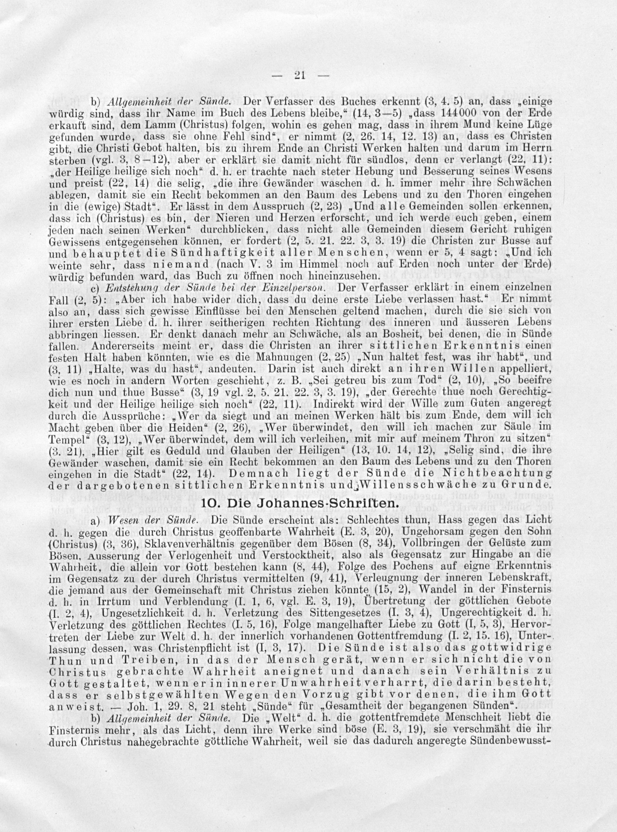 c) Entstehung der Sünde bei der Einzelperson. Der Verfasser erklärt in einem einzelnen Fall(2, 5):„Aber ich habe wider dich, dass du deine erste Liebe verlassen hast.“ Er nimmt also an, dass sich gewisse Einflüsse bei den Menschen geltend machen, durch die sie sich von ihrer ersten Liebe d. h. ihrer seitherigen rechten Richtung des inneren und äusseren Lebens abbringen liessen. Er denkt danach mehr an Schwäche, als an Bosheit, bei denen, die in Sünde fallen. Andererseits meint er, dass die Christen an ihrer sittlichen Erkenntnis einen festen Halt haben könnten, wie es die Mahnungen(2, 25)„Nun haltet fest, was ihr habt“, und (3, 11)„Halte, was du hast“, andeuten. Darin ist auch direkt an ihren Willen appelliert, wie es noch in andern Worten geschieht, z. B.„Sei getreu bis zum Tod“(2, 10),„So beeifre dich nun und thue Busse“(3, 19 vgl. 2, 5. 21. 22. 3, 3. 19),„der Gerechte thue noch Gerechtig- keit und der Heilige heilige sich noch“(22, 11). Indirekt wird der Wille zum Guten angeregt durch die Aussprüche:„Wer da siegt und an meinen Werken hält bis zum Ende, dem will ich Macht geben über die Heiden“(2, 26),„Wer überwindet, den will ich machen zur Säule im Tempel“(3, 12),„Wer überwindet, dem will ich verleihen, mit mir auf meinem Thron zu sitzen“ (3. 21),„Hier gilt es Geduld und Glauben der Heiligen“(13, 10. 14, 12),„Selig sind, die ihre Gewänder waschen, damit sie ein Recht bekommen an den Baum des Lebens und zu den Thoren eingehen in die Stadt“(22, 14). Demnach liegt der Sünde die Nichtbeachtung der dargebotenensittlichen Erkenntnis und Willensschwäche zu Grunde.