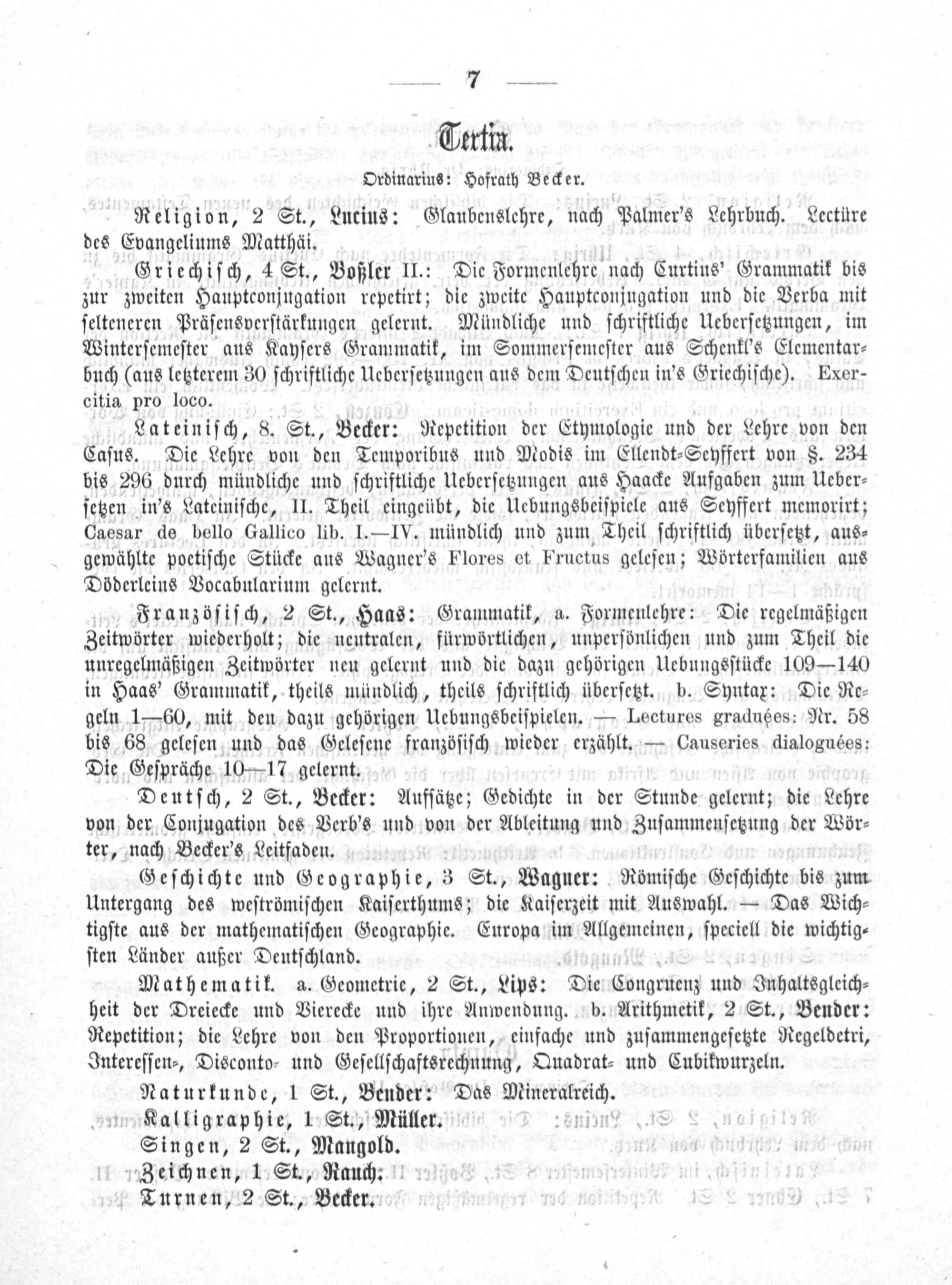 Griechiſch, 4 St., Boßler II.: Die Formenlehre nach Curtius' Grammatik bis zur zweiten Hauptconjugation repetirt; die zweite Hauptconjugation und die Verba mit ſelteneren Präſensverſtärkungen gelernt. Mündliche und ſchriftliche Ueberſetzungen, im Winterſemeſter aus Kayſers Grammatik, im Sommerſemeſter aus Schenkl's Elementar⸗ buch(aus letzterem 30 ſchriftliche Ueberſetzungen aus dem Deutſchen in's Griechiſche). Exer- citia pro loco.
