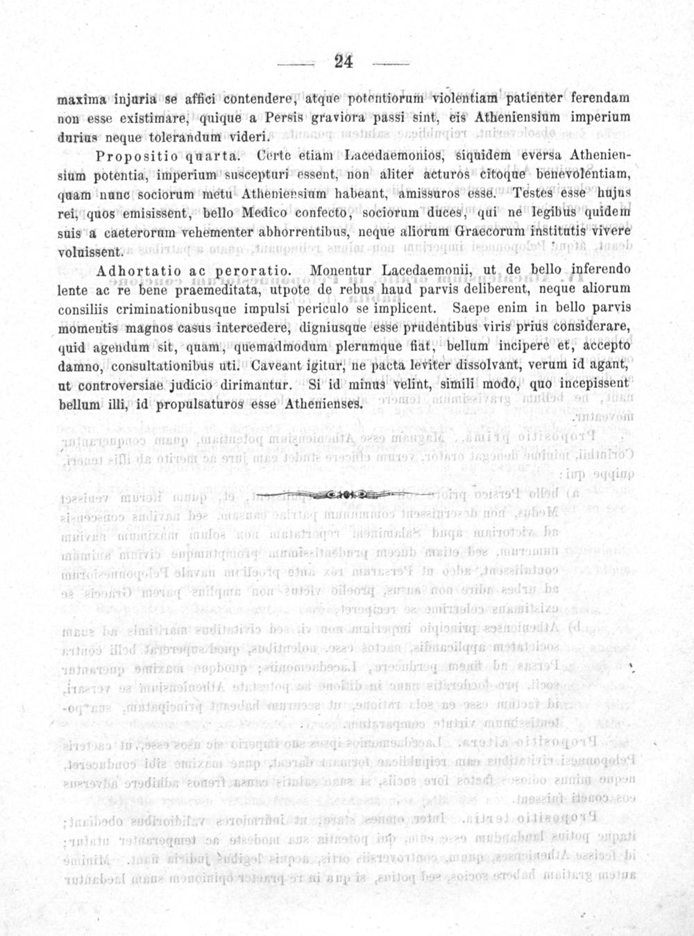 Adhortatio ac peroratio. Monentur Lacedaemonii, ut de bello inferendo lente ac re bene praemeditata, utpote de rebus haud parvis deliberent, neque aliorum consiliis criminationibusque impulsi periculo se implicent. Saepe enim in bello parvis momentis magnos casus intercedere, digniusque esse prudentibus viris prius considerare, quid agendum sit, quam, quemadmodum plerumque fiat, bellum incipere et, accepto damno, consultationibus uti. Caveant igitur, ne pacta leviter dissolvant, verum id agant, ut controversiae judicio dirimantur. Si id minus velint, simili modo, quo incepissent bellum illi, id propulsaturos esse Athenienses.
