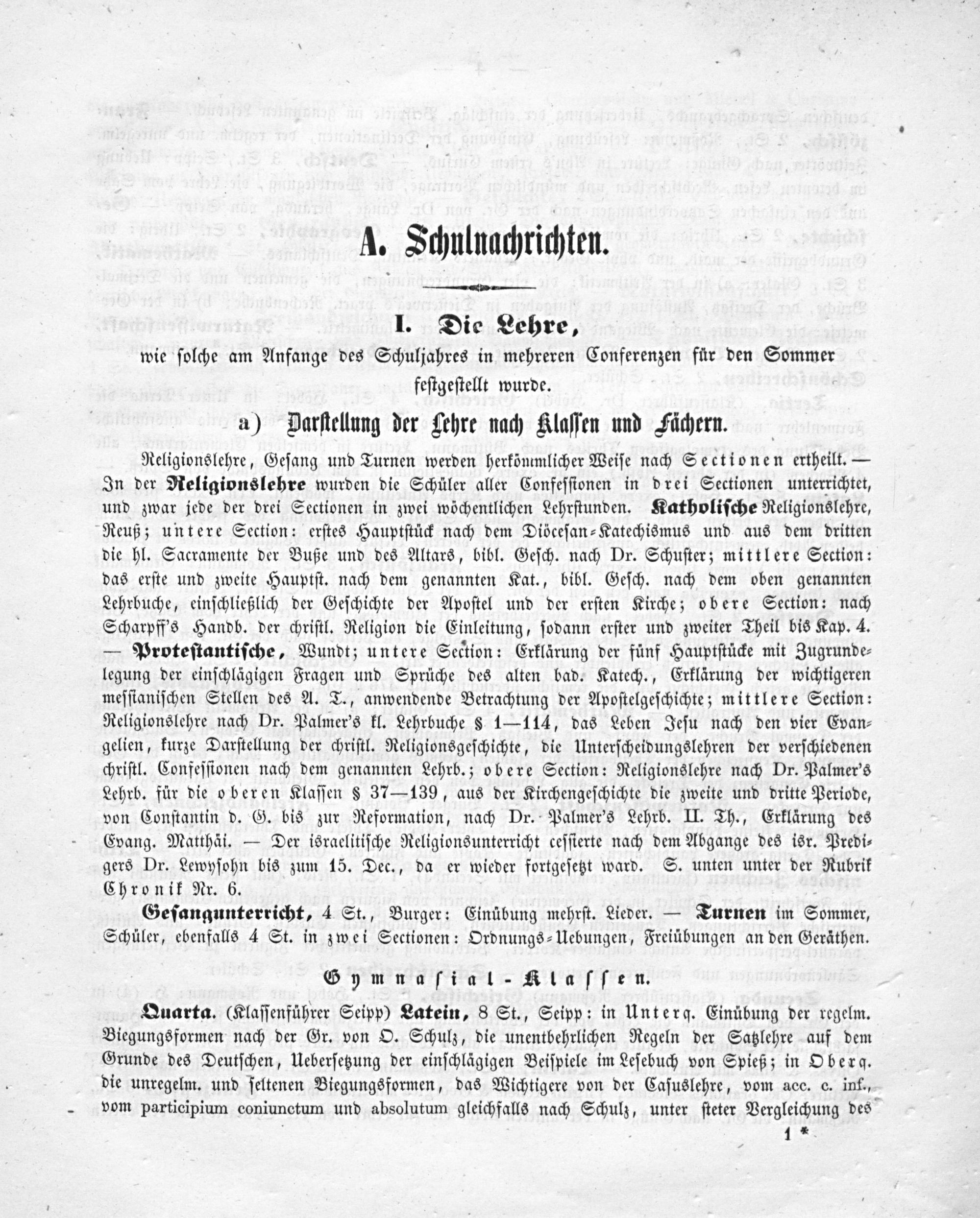 Quarta.(Klaſſenführer Seipp) Latein, 8 St., Seipp: in Unterq. Einübung der regelm. Biegungsformen nach der Gr. von O. Schulz, die unentbehrlichen Regeln der Satzlehre auf dem Grunde des Deutſchen, Ueberſetzung der einſchlägigen Beiſpiele im Leſebuch von Spieß; in Oberg. die unregelm. und ſeltenen Biegungsformen, das Wichtigere von der Caſuslehre, vom acc. c. inf., vom participium coniunctum und absolutum gleichfalls nach Schulz, unter ſteter Vergleichung des