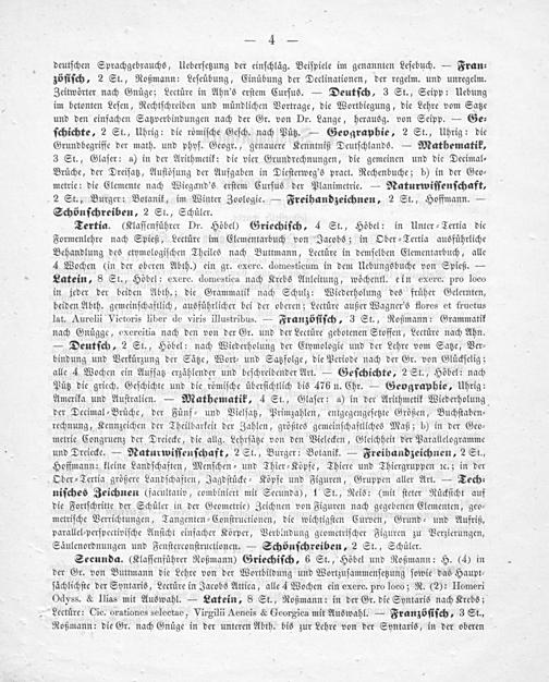 Tertia.(Klaſſenfuͤhrer Dr. Höbel) Griechiſch, 4 St., Höbel: in Unter⸗Tertia die Formenlehre nach Spieß, Lectüre im Elementarbuch von Jacobs; in Ober⸗Tertia ausführliche Behandlung des etymologiſchen Theiles nach Buttmann, Lectüre in demſelben Elementarbuch, alle 4 Wochen(in der oberen Abth.) ein gr. exerc. domesticum in dem Uebungsbuche von Spieß.— Latein, 8 St., Höbel: exerc. domestica nach Krebs Anleitung, wöchentl. ein exerc. pro loco in jeder der beiden Abth.; die Grammatik nach Schulz: Wiederholung des früher Gelernten, beiden Abth. gemeinſchaftlich, ausführlicher bei der oberen; Lectuͤre außer Wagner's flores et fructus lat. Aurelii Victoris liber de viris illustribus.— Franzöſiſch, 3 St., Roßmann: Grammatik nach Gnügge, exercitia nach den von der Gr. und der Lectüre gebotenen Stoffen, Lectüre nach Ahn. — Deutſch, 2 St., Höbel: nach Wiederholung der Etymologie und der Lehre vom Satze, Ver⸗ bindung und Verkürzung der Sätze, Wort⸗ und Satzfolge, die Periode nach der Gr. von Glückſelig; alle 4 Wochen ein Aufſatz erzählender und beſchreibender Art.— Geſchichte, 2 St., Höbel: nach Pütz die griech. Geſchichte und die römiſche überſichtlich bis 476 n. Chr.— Geographie, Uhrig: Amerika und Auſtralien.— Mathematik, 4 St., Glaſer: a) in der Arithmetik Wiederholung der Decimal⸗Brüche, der Fünf⸗ und Vielſatz, Primzahlen, entgegengeſetzte Größen, Buchſtaben⸗ rechnung, Kennzeichen der Theilbarkeit der Zahlen, größtes gemeinſchaftliches Maß; b) in der Geo⸗ metrie Congruenz der Dreiecke, die allg. Lehrſätze von den Vielecken, Gleichheit der Parallelogramme und Dreiecke.— Naturwiſſenſchaft, 2 St., Burger: Botanik.— Freihandzeichnen, 2 St., Hoffmann: kleine Landſchaften, Menſchen⸗ und Thier⸗Köpfe, Thiere und Thiergruppen ꝛc.; in der Ober⸗Tertia größere Landſchaften, Jagdſtücke⸗Köpfe und Figuren, Gruppen aller Art.— Tech⸗ niſches Zeichnen(facultativ, combiniert mit Secunda), 1 St., Reis:(mit ſteter Rückſicht auf die Fortſchritte der Schüler in der Geometrie) Zeichnen von Figuren nach gegebenen Elementen, geo⸗ metriſche Verrichtungen, Tangenten⸗Conſtructionen, die wichtigſten Curven, Grund⸗ und Aufriß, parallel⸗perſpectiviſche Anſicht einfacher Körper, Verbindung geometriſcher Figuren zu Verzierungen, Säulenordnungen und Fenſterconſtructionen.— Schönſchreiben, 2 St., Schüler.