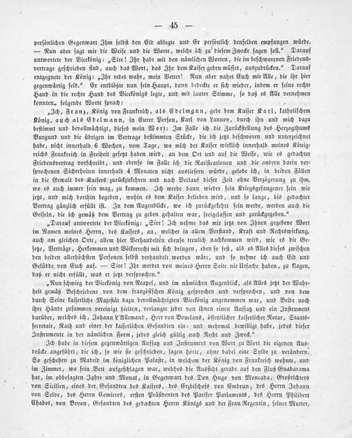 „Nun ſchwieg der Vicekönig von Neapel, und im nämlichen Augenblick, als Alles jetzt der Wahr⸗ heit gemäß Beſchriebene von dem franzöſiſchen König geſprochen und verſprochen, und von dem durch Seine kaiſerliche Majeſtät dazu bevollmächtigten Vicekönig angenommen war, und Beide noch ihre Hände zuſammen vereinigt hielten, verlangte jeder von ihnen einen Aufſatz und ein Inſtrument darüber, welches ich, Johann L'Allemand, Herr von Bouclans, öffentlicher kaiſerlicher Notar, Staats⸗ ſecretair, Rath und einer der kaiſerlichen Geſandten ein⸗ und mehrmal bewilligt habe, jedes dieſer Inſtrumente in der nämlichen Form, jedes gleich gültig nach Recht und Zweck.“