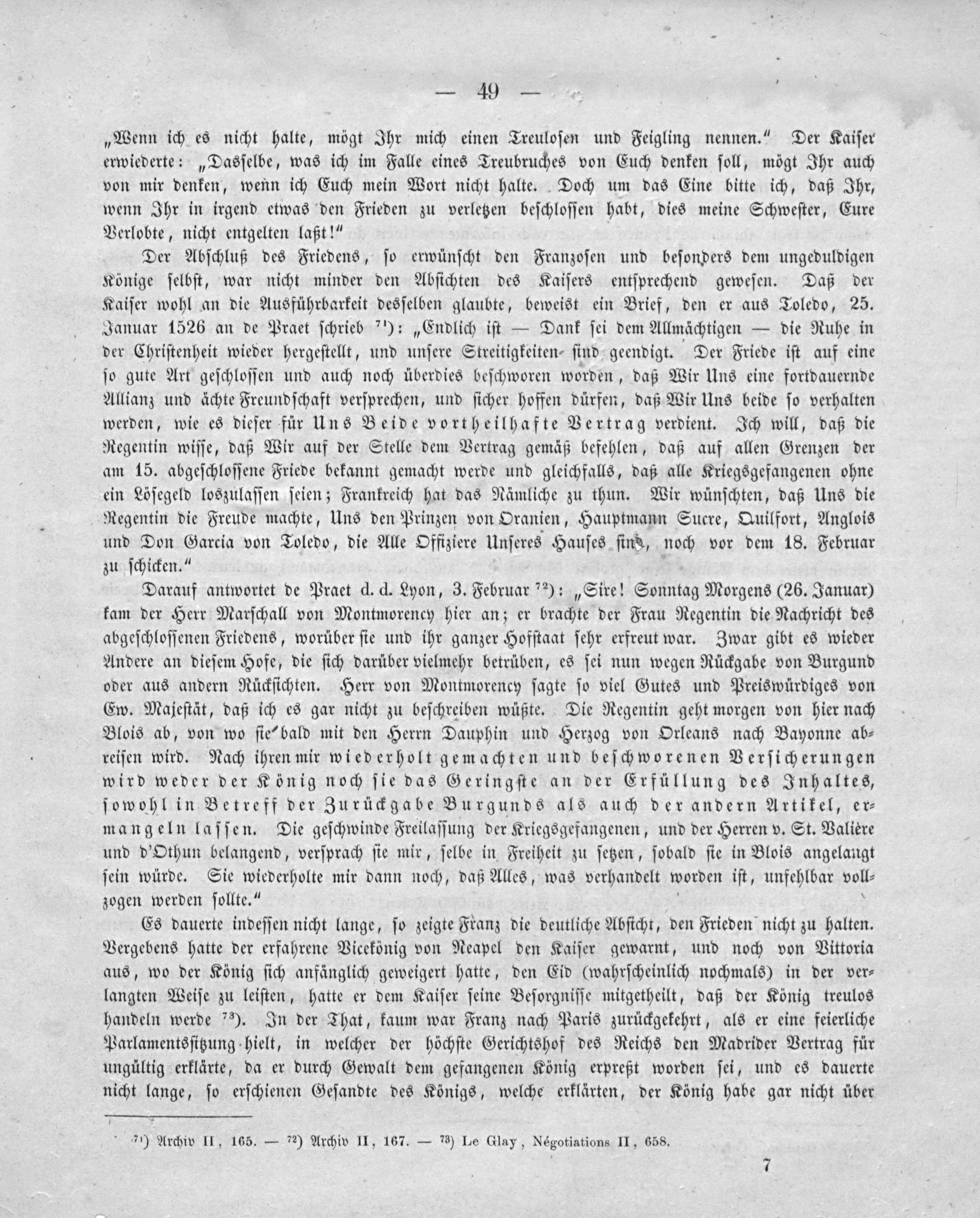 Der Abſchluß des Friedens, ſo erwünſcht den Franzoſen und beſonders dem ungeduldigen Könige ſelbſt, war nicht minder den Abſichten des Kaiſers entſprechend geweſen. Daß der Kaiſer wohl an die Ausführbarkeit desſelben glaubte, beweist ein Brief, den er aus Toledo, 25. Januar 1526 an de Praet ſchrieb*):„Endlich iſt— Dank ſei dem Allmächtigen— die Ruhe in der Chriſtenheit wieder hergeſtellt, und unſere Streitigkeiten⸗ ſind geendigt. Der Friede iſt auf eine ſo gute Art geſchloſſen und auch noch überdies beſchworen worden, daß Wir Uns eine fortdauernde Allianz und ächte Freundſchaft verſprechen, und ſicher hoffen dürfen, daß Wir Uns beide ſo verhalten werden, wie es dieſer für Uns Beide vortheilhafte Vertrag verdient. Ich will, daß die Regentin wiſſe, daß Wir auf der Stelle dem Vertrag gemäß befehlen, daß auf allen Grenzen der am 15. abgeſchloſſene Friede bekannt gemacht werde und gleichfalls, daß alle Kriegsgefangenen ohne ein Löſegeld loszulaſſen ſeien; Frankreich hat das Nämliche zu thun. Wir wünſchten, daß Uns die Regentin die Freude machte, Uns den Prinzen von Oranien, Hauptmann Sucre, Quilfort, Anglois und Don Garcia von Toledo, die Alle Offiziere Unſeres Hauſes ſing, noch vor dem 18. Februar zu ſchicken.“