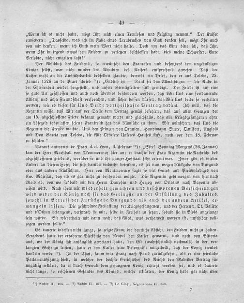 Darauf antwortet de Praet d. d. Lyon, 3. Februar**):„Sire! Sonntag Morgens(26. Januar) kam der Herr Marſchall von Montmorency hier an; er brachte der Frau Regentin die Nachricht des abgeſchloſſenen Friedens, worüber ſie und ihr ganzer Hofſtaat ſehr erfreut war. Zwar gibt es wieder Andere an dieſem Hofe, die ſich darüber vielmehr betrüben, es ſei nun wegen Rückgabe von Burgund oder aus andern Rückſichten. Herr von Montmorency ſagte ſo viel Gutes und Preiswürdiges von Ew. Majeſtät, daß ich es gar nicht zu beſchreiben wüßte. Die Regentin geht morgen von hier nach Blois ab, von wo ſie bald mit den Herrn Dauphin und Herzog von Orleans nach Bayonne ab⸗ reiſen wird. Nach ihren mir wiederholt gemachten und beſchworenen Verſicherungen wird weder der König noch ſie das Geringſte an der Erfüllung des Inhaltes, ſowohl in Betreff der Zurückgabe Burgunds als auch der andern Artikel, er⸗ mangeln laſſen. Die geſchwinde Freilaſſung der Kriegsgefangenen, und der Herren v. St. Valiere und d'Othun belangend, verſprach ſie mir, ſelbe in Freiheit zu ſetzen, ſobald ſie in Blois angelangt ſein würde. Sie wiederholte mir dann noch, daß Alles, was verhandelt worden iſt, unfehlbar voll⸗ zogen werden ſollte.“