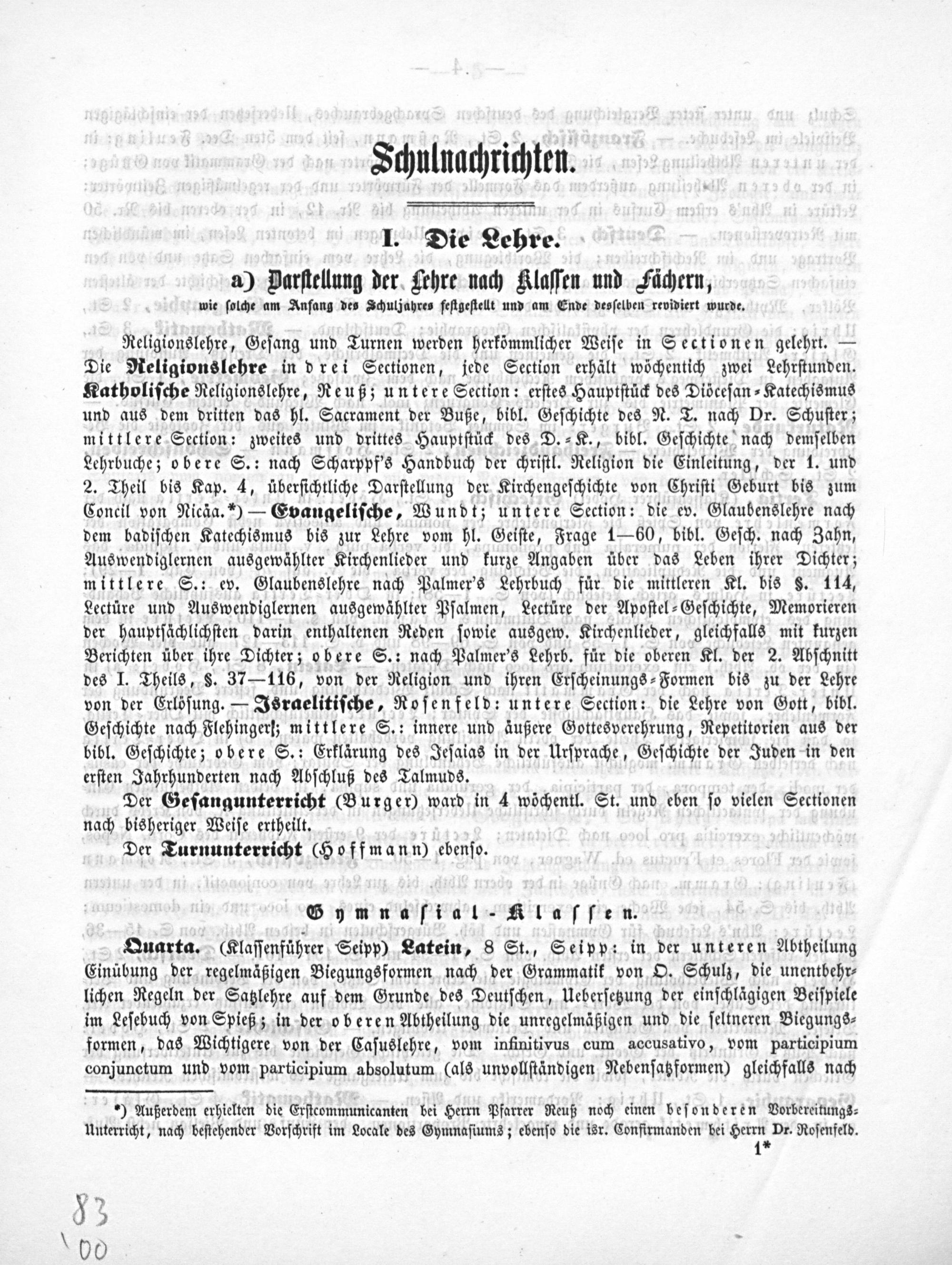 Religionslehre, Geſang und Turnen werden herkömmlicher Weiſe in Sectionen gelehrt.— Die Religionslehre in drei Sectionen, jede Section erhält wöchentich zwei Lehrſtunden. Katholiſche Religionslehre, Reuß; untere Section: erſtes Hauptſtück des Diöceſan⸗Katechismus und aus dem dritten das hl. Sacrament der Buße, bibl. Geſchichte des N. T. nach Dr. Schuſter; mittlere Section: zweites und drittes Hauptſtück des D.⸗K., bibl. Geſchichte nach demſelben Lehrbuche; obere S.: nach Scharppf's Handbuch der chriſtl. Religion die Einleitung, der 1. und 2. Theil bis Kap. 4, überſichtliche Darſtellung der Kirchengeſchichte von Chriſti Geburt bis zum Concil von Nicäa.*)— Evangeliſche, Wundtz untere Section: die ev. Glaubenslehre nach dem badiſchen Katechismus bis zur Lehre vom hl. Geiſte, Frage 1—60, bibl. Geſch. nach Zahn, Auswendiglernen ausgewählter Kirchenlieder und kurze Angaben über das Leben ihrer Dichter; mittlere S.: ev. Glaubenslehre nach Palmer's Lehrbuch füͤr die mittleren Kl. bis§. 114, Lectüre und Auswendiglernen ausgewählter Pſalmen, Lectüre der Apoſtel⸗Geſchichte, Memorieren der hauptſächlichſten darin enthaltenen Reden ſowie ausgew. Kirchenlieder, gleichfalls mit kurzen Berichten über ihre Dichter; obere S.: nach Palmer's Lehrb. für die oberen Kl. der 2. Abſchnitt des I. Theils,§. 37— 116, von der Religion und ihren Erſcheinungs⸗Formen bis zu der Lehre von der Erlöſung.— Israelitiſche, Roſenfeld: untere Section: die Lehre von Gott, bibl. Geſchichte nach Flehingert; mittlere S.: innere und äußere Gottesverehrung, Repetitorien aus der bibl. Geſchichte; obere S.: Erklärung des Jeſaias in der Urſprache, Geſchichte der Juden in den erſten Jahrhunderten nach Abſchluß des Talmuds.