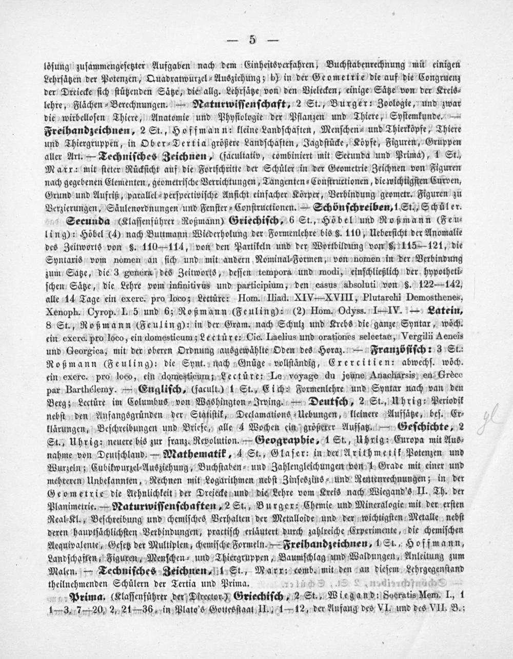 Seeunda(Klaſſenführer Roßmann) Griechiſch, 6 St., Höbel und Roßmann(Feu⸗ ling): Höbel(4) nach Buttmann Wiederholung der Formenlehre bis§. 110, Ueberſicht der Anomalie des Zeitworts von§. 110—114, von den Partikeln und der Wortbildung von§. 115—121, die Syntaris vom nöomen an ſich und mit andern Nominal⸗Formen, von nomen in der Verbindung zum Satze, die 3 genera des Zeitworts, deſſen tempora und modi, einſchließlich der hypotheti⸗ ſchen Sätze, die Lehre vom infinitivus und participium, den casus absoluti von§. 122— 142, alle 14 Tage ein exerc. pro loco; Lectüre: Hom. Iliad. XIV-XVIII, Plutarchi Demosthenes, Xenoph. Cyrop. I. 5 und 6 Roßmann(Feuling):(2) Hom. Odyss.-IV.— Latein, 8 St., Roßmann(Feuling): in der Gram. nach Schulz und Krebs die ganze Syntax, wöch. ein exerc. pro loco, ein domesticum; Lectüre: Cic. Laelius und orationes selectae, Vergili Aeneis und Georgica, mit der oberen Ordnung ausgewählte Oden des Horaz.— Franzöſiſch: 3 St.: Roßmann(Feuling): die Synt. nach Gnüge vollſtändig, Exercitien: abwechſ. wöch. ein exerc. pro loco, ein domesticum; Lectüre: Le voyage du jeune Anacharsis en Grèce par Barthélemy.— Engliſch,(facult.) 1 St., Eiche Formenlehre und Syntar nach van den Berg; Lectüre im Columbus von Washington⸗Irving.— Deutſch, 2 St., Uhrig: Periodik nebſt den Anfangsgründen der Statiſtik, Declamations⸗Uebungen, kleinere Aufſätze, beſ. Er⸗ klärungen, Beſchreibungen und Briefe, alle 4 Wochen ein größerer Aufſatz.— Geſchichte, 2 St., Uhrig; neuere bis zur franz. Revolution.— Geographie, 1 St., Uhrig: Europa mit Aus⸗ nahme von Deutſchland.— Mathematik, 4 St., Glaſer: in der Arithmetik Potenzen und Wurzeln; Cubikwurzel⸗Ausziehung, Buchſtaben⸗ und Zahlengleichungen von 1 Grade mit einer und mehreren Unbekannten, Rechnen mit Logarithmen nebſt Zinſeszins⸗ und Rentenrechnungen; in der Geometrie die Aehnlichkeit der Dreiecke und die Lehre vom Kreis nach Wiegand's II. Th. der Planimetrie.— Naturwiſſenſchaften, 2 St., Burger⸗ Chemie und Mineralogie mit der erſten Real⸗Kl., Beſchreibung und chemiſches Verhalten der Metalloide und der wichtigſten Metalle nebſt deren hauptſächlichſten Verbindungen, practiſch erläutert durch zahlreiche Erperimente, die chemiſchen Aequivalente, Geſetz der Multiplen, chemiſche Formeln.— Freihandzeichnen, 1 St., Hoffmann, Landſchaften, Figuren, Menſchen⸗ und Thiergruppen, Baumſchlag und Waldungen, Anleitung zum Malen.— Techniſches Zeichnen, 1 St., APanprslcopi⸗ imit den⸗ an dleſeun Kahrgegsnſtam helnehmenden Schülern der Tertia und Prima.