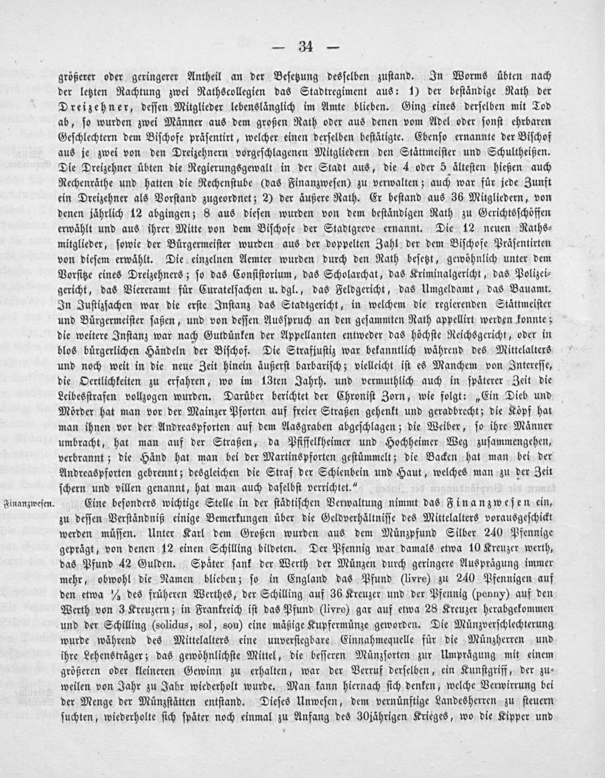 größerer oder geringerer Antheil an der Beſetzung desſelben zuſtand. In Worms übten nach der letzten Rachtung zwei Rathscollegien das Stadtregiment aus: 1) der beſtändige Rath der Dreizehner, deſſen Mitglieder lebenslänglich im Amte blieben. Ging eines derſelben mit Tod ab, ſo wurden zwei Männer aus dem großen Rath oder aus denen vom Adel oder ſonſt ehrbaren Geſchlechtern dem Biſchofe präſentirt, welcher einen derſelben beſtätigte. Ebenſo ernannte der Biſchof aus je zwei von den Dreizehnern vorgeſchlagenen Mitgliedern den Stättmeiſter und Schultheißen. Die Dreizehner übten die Regierungsgewalt in der Stadt aus, die 4 oder 5 älteſten hießen auch Rechenräthe und hatten die Rechenſtube(das Finanzweſen) zu verwalten; auch war für jede Zunft ein Dreizehner als Vorſtand zugeordnet; 2) der äußere Rath. Er beſtand aus 36 Mitgliedern, von denen jährlich 12 abgingen; 8 aus dieſen wurden von dem beſtändigen Rath zu Gerichtsſchöffen erwählt und aus ihrer Mitte von dem Biſchofe der Stadtgreve ernannt. Die 12 neuen Raths⸗ mitglieder, ſowie der Bürgermeiſter wurden aus der doppelten Zahl der dem Biſchofe Präſentirten von dieſem erwählt. Die einzelnen Aemter wurden durch den Rath beſetzt, gewöhnlich unter dem Vorſitze eines Dreizehners; ſo das Conſiſtorium, das Scholarchat, das Kriminalgericht, das Polizei⸗ gericht, das Viereramt für Curatelſachen u. dgl., das Feldgericht, das Umgeldamt, das Bauamt. In Juſtizſachen war die erſte Inſtanz das Stadtgericht, in welchem die regierenden Stättmeiſter und Bürgermeiſter ſaßen, und von deſſen Ausſpruch an den geſammten Rath appellirt werden konnte; die weitere Inſtanz war nach Gutdünken der Appellanten entweder das höchſte Reichsgericht, oder in blos bürgerlichen Händeln der Biſchof. Die Strafiuſtiz war bekanntlich während des Mittelalters und noch weit in die neue Zeit hinein äußerſt barbariſch; vielleicht iſt es Manchem von Intereſſe, die Oertlichkeiten zu erfahren, wo im 13ten Jahrh. und vermuthlich auch in ſpäterer Zeit die Leibesſtrafen vollzogen wurden. Darüber berichtet der Chroniſt Zorn, wie folgt:„Ein Dieb und Mörder hat man vor der Mainzer Pforten auf freier Straßen gehenkt und geradbrecht; die Köpf hat man ihnen vor der Andreaspforten auf dem Aasgraben abgeſchlagen; die Weiber, ſo ihre Männer umbracht, hat man auf der Straßen, da Pfiffelkheimer und Hochheimer Weg zuſammengehen, verbrannt; die Händ hat man bei der Martinspforten geſtümmelt; die Backen hat man bei der Andreaspforten gebrennt; desgleichen die Straf der Schienbein und Haut, welches man zu der Zeit ſchern und villen genannt, hat man auch daſelbſt verrichtet.“