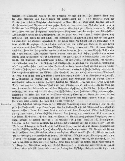 Eine beſonders wichtige Stelle in der ſtädtiſchen Verwaltung nimmt das Finanzweſen ein, zu deſſen Verſtändniß einige Bemerkungen über die Geldverhältniſſe des Mittelalters vorausgeſchickt werden müſſen. Unter Karl dem Großen wurden aus dem Münzpfund Silber 240 Pfennige geprägt, von denen 12 einen Schilling bildeten. Der Pfennig war damals etwa 10 Kreuzer werth, das Pfund 42 Gulden. Später ſank der Werth der Münzen durch geringere Ausprägung immer mehr, obwohl die Namen blieben; ſo in England das Pfund(livre) zu 240 Pfennigen auf den etwa 4 des früheren Werthes, der Schilling auf 36 Kreuzer und der Pfennig(penny) auf den Werth von 3 Kreuzern; in Frankreich iſt das Pfund(livre) gar auf etwa 28 Kreuzer herabgekommen und der Schilling(solidus, sol, sou) eine mäßige Kupfermünze geworden. Die Münzverſchlechterung wurde während des Mittelalters eine unverſiegbare Einnahmequelle für die Münzherren und ihre Lehensträger; das gewöhnlichſte Mittel, die beſſeren Münzſorten zur Umprägung mit einem größeren oder kleineren Gewinn zu erhalten, war der Verruf derſelben, ein Kunſtgriff, der zu⸗ weilen von Jahr zu Jahr wiederholt wurde. Man kann hiernach ſich denken, welche Verwirrung bei der Menge der Münzſtätten entſtand. Dieſes Unweſen, dem vernünftige Landesherren zu ſteuern ſuchten, wiederholte ſich ſpäter noch einmal zu Anfang des 30jährigen Krieges, wo die Kipper und