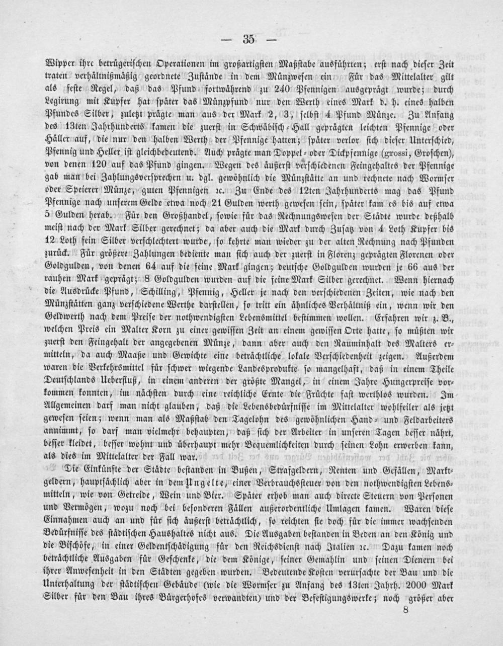 Wipper ihre betrügeriſchen Operationen im großartigſten Maßſtabe ausführten; erſt nach dieſer Zeit traten verhältnißmäßig geordnete Zuſtaͤnde in dem Münzweſen ein Für das Mittelalter gilt als feſte Regel, daß das Pfund fortwährend zu 240 Pfennigen ausgeprägt wurde; durch Legirung mit Kupfer hat ſpäter das Münzpfund nur den Werth eines Mark d. h. eines halben Pfundes Silber, zuletzt prägte man aus der Mark 2, 3, ſelbſt 4 Pfund Münze. Zu Anfang des 13ten Jahrhunderts kamen die zuerſt in Schwäbiſch⸗Hall geprägten leichten Pfennige oder Häller auf, die nur den halben Werth der Pfennige hatten; ſpäter verlor ſich dieſer Unterſchied, Pfennig und Heller iſt gleichbedeutend. Auch prägte man Doppel⸗oder Dickpfennige(grossi, Groſchen), von denen 120 auf das Pfund gingen. Wegen des äußerſt verſchiedenen Feingehaltes der Pfennige gab man bei Zahlungsverſprechen u. dgl. gewöhnlich die Münzſtätte an und rechnete nach Wormſer oder Speierer Münze, guten Pfennigen ꝛc. Zu Ende des 12ten Jahrhunderts mag das Pfund Pfennige nach unſerem Gelde etwa noch 21 Gulden werth geweſen ſein, ſpäter kam es bis auf etwa 5 Gulden herab. Für den Großhandel, ſowie für das Rechnungsweſen der Städte wurde deßhalb meiſt nach der Mark Silber gerechnet; da aber auch die Mark durch Zuſatz von 4 Loth Kupfer bis 12 Loth fein Silber verſchlechtert wurde, ſo kehrte man wieder zu der alten Rechnung nach Pfunden zurück. Für größere Zahlungen bediente man ſich auch der zuerſt in Florenz geprägten Florenen oder Goldgulden, von denen 64 auf die feine Mark gingen; deutſche Goldgulden wurden je 66 aus der rauhen Mark geprägt; 8 Goldgulden wurden auf die feine Mark Silber gerechnet. Wenn hiernach die Ausdrücke Pfund, Schilling, Pfennig, Heller je nach den verſchiedenen Zeiten, wie nach den Münzſtäͤtten ganz verſchiedene Werthe darſtellen, ſo tritt ein ähnliches Verhältniß ein, wenn wir den Geldwerth nach dem Preiſe der nothwendigſten Lebensmittel beſtimmen wollen. Erfahren wir z. B., welchen Preis ein Malter Korn zu einer gewiſſen Zeit an einem gewiſſen Orte hatte, ſo müßten wir zuerſt den Feingehalt der angegebenen Münze, dann aber auch den Rauminhalt des Malters er⸗ mitteln, da auch Maaße und Gewichte eine beträchtliche lokale Verſchiedenheit zeigen. Außerdem waren die Verkehrsmittel für ſchwer wiegende Landesprodukte ſo mangelhaft, daß in einem Theile Deutſchlands Ueberfluß, in einem anderen der größte Mangel, in einem Jahre Hungerpreiſe vor⸗ kommen konnten, im nächſten durch eine reichliche Ernte die Früchte faſt werthlos wurden. Im Allgemeinen darf man nicht glauben, daß die Lebensbedürfniſſe im Mittelalter wohlfeiler als jetzt geweſen ſeien;z wenn man als Maßſtab den Tagelohn des gewöhnlichen Hand⸗ und Feldarbeiters annimmt, ſo darf man vielmehr behaupten, daß ſich der Arbeiter in unſeren Tagen beſſer nährt, beſſer kleidet, beſſer wohnt und überhaupt mehr Bequemlichkeiten durch ſeinen Lohn erwerben kann, als dies im Mittelalter der Fall war.