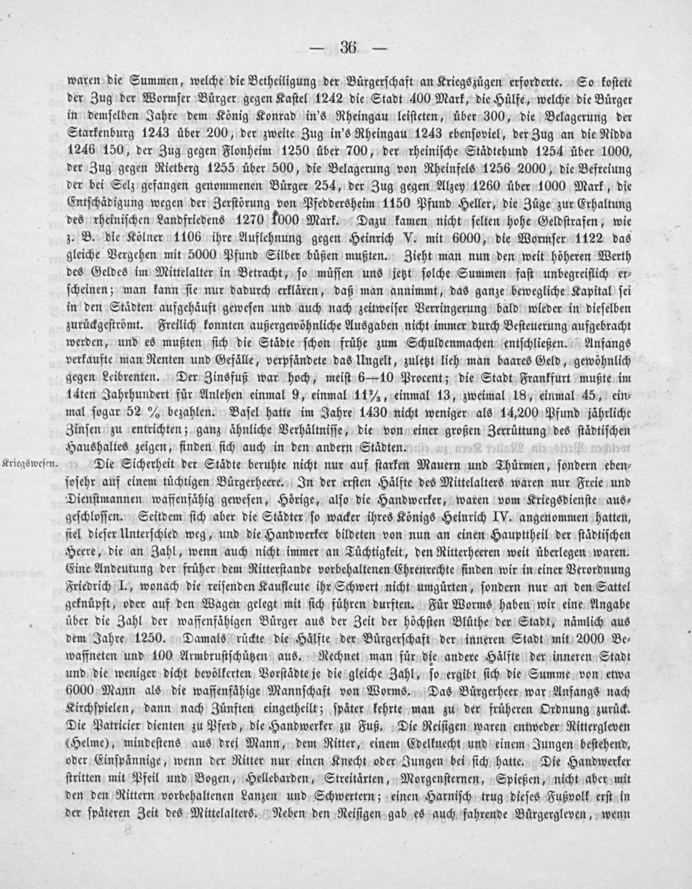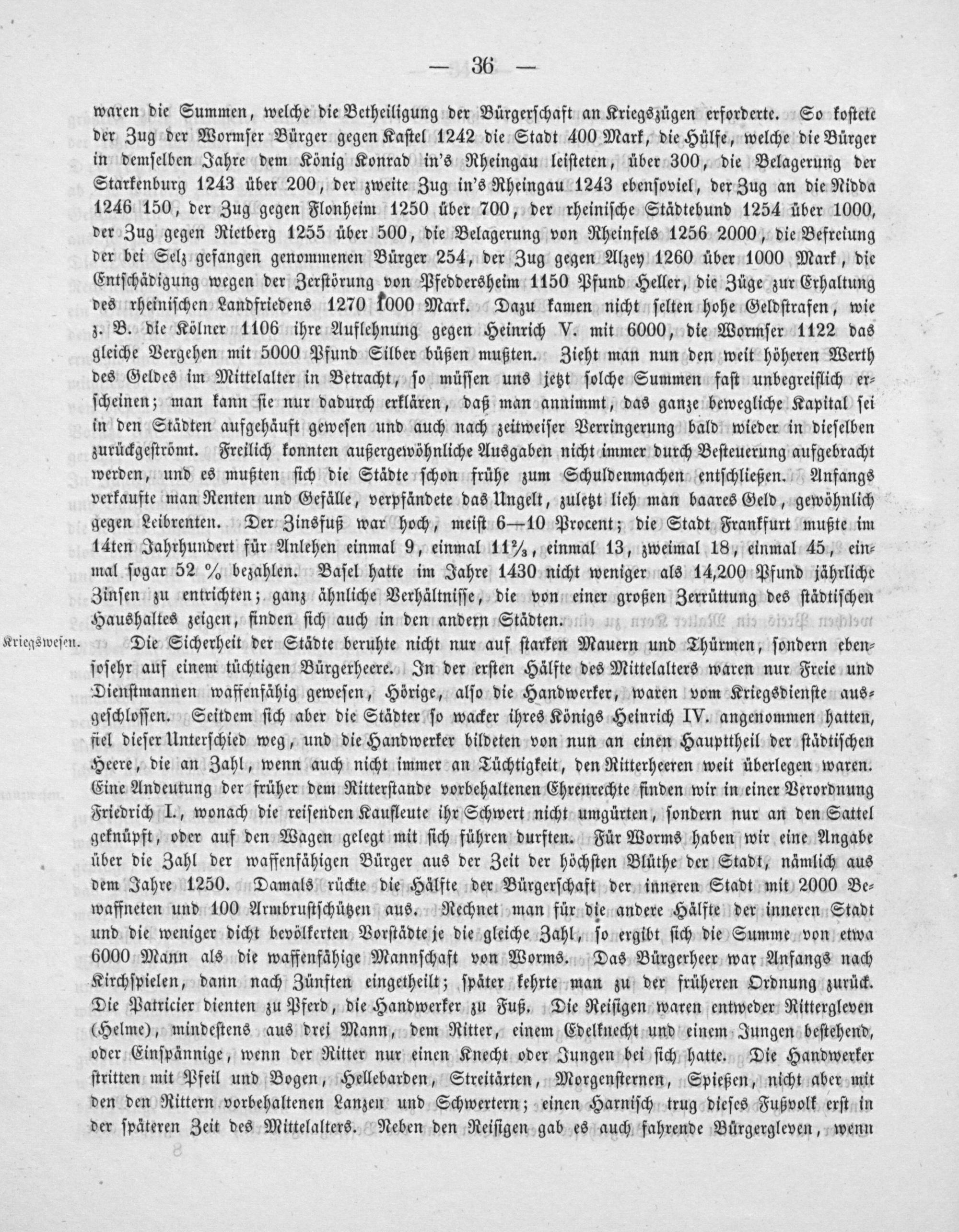 waren die Summen, welche die Betheiligung der Bürgerſchaft an Kriegszügen erforderte. So koſtete der Zug der Wormſer Bürger gegen Kaſtel 1242 die Stadt 400 Mark, die Hülfe, welche die Bürger in demſelben Jahre dem König Konrad in's Rheingau leiſteten, über 300, die Belagerung der Starkenburg 1243 über 200, der zweite Zug in's Rheingau 1243 ebenſoviel, der Zug an die Nidda 1246 150, der Zug gegen Flonheim 1250 über 700, der rheiniſche Städtebund 1254 über 1000, der Zug gegen Rietberg 1255 über 500, die Belagerung von Rheinfels 1256 2000, die Befreiung der bei Selz gefangen genommenen Bürger 254, der Zug gegen Alzey 1260 über 1000 Mark, die Entſchädigung wegen der Zerſtörung von Pfeddersheim 1150 Pfund Heller, die Züge zur Erhaltung des rheiniſchen Landfriedens 1270 f000 Mark. Dazu kamen nicht ſelten hohe Geldſtrafen, wie z. B. die Kölner 1106 ihre Auflehnung gegen Heinrich V. mit 6000, die Wormſer 1122 das gleiche Vergehen mit 5000 Pfund Silber büßen mußten. Zieht man nun den weit höheren Werth des Geldes im Mittelalter in Betracht, ſo müſſen uns jetzt ſolche Summen faſt unbegreiflich er⸗ ſcheinen; man kann ſie nur dadurch erklären, daß man annimmt, das ganze bewegliche Kapital ſei in den Städten aufgehäuft geweſen und auch nach zeitweiſer Verringerung bald wieder in dieſelben zurückgeſtrömt. Freilich konnten außergewöhnliche Ausgaben nicht immer durch Beſteuerung aufgebracht werden, und es mußten ſich die Städte ſchon frühe zum Schuldenmachen entſchließen. Anfangs verkaufte man Renten und Gefälle, verpfändete das Ungelt, zuletzt lieh man baares Geld, gewöhnlich gegen Leibrenten. Der Zinsfuß war hoch, meiſt 6— 10 Procent; die Stadt Frankfurt mußte im 14ten Jahrhundert für Anlehen einmal 9, einmal 11 ¾, einmal 13, zweimal 18, einmal 45, ein⸗ mal ſogar 52 ℳ bezahlen. Baſel hatte im Jahre 1430 nicht weniger als 14,200 Pfund jährliche Zinſen zu entrichten; ganz ähnliche Verhältniſſe, die von einer großen Zerrüttung des ſtadtiſchen Haushaltes zeigen, finden ſich auch in den andern Städten.