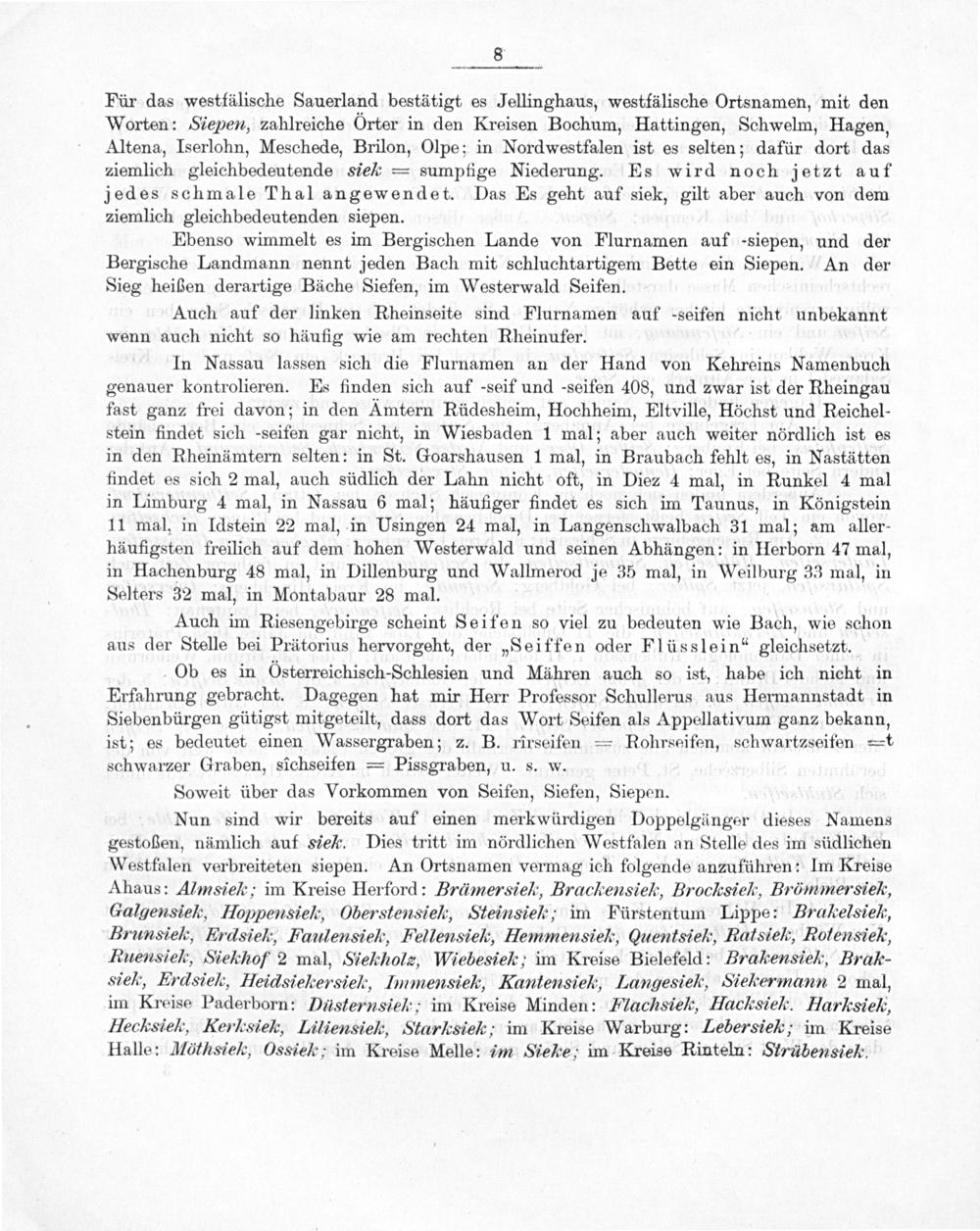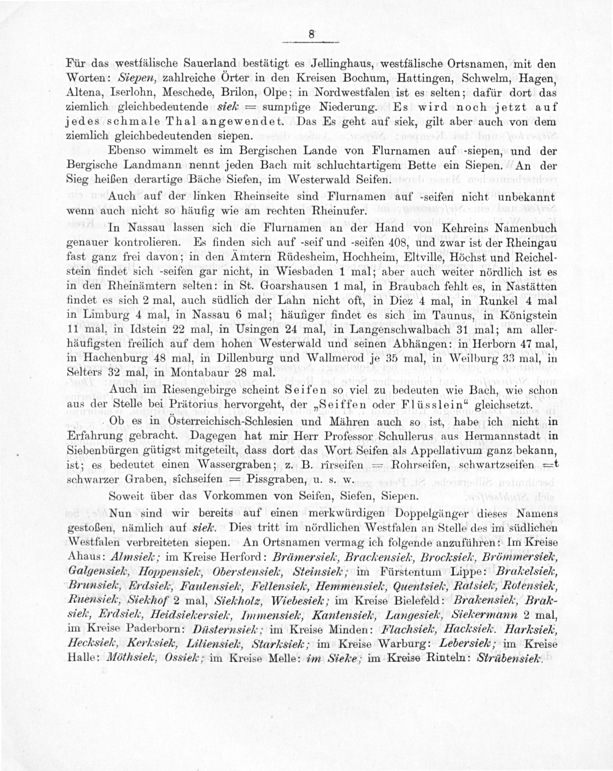 Ebenso wimmelt es im Bergischen Lande von Flurnamen auf»siepen, und der Bergische Landmann nennt jeden Bach mit schluchtartigem Bette ein Siepen. An der Sieg heißen derartige Bäche Siefen, im Westerwald Seifen.