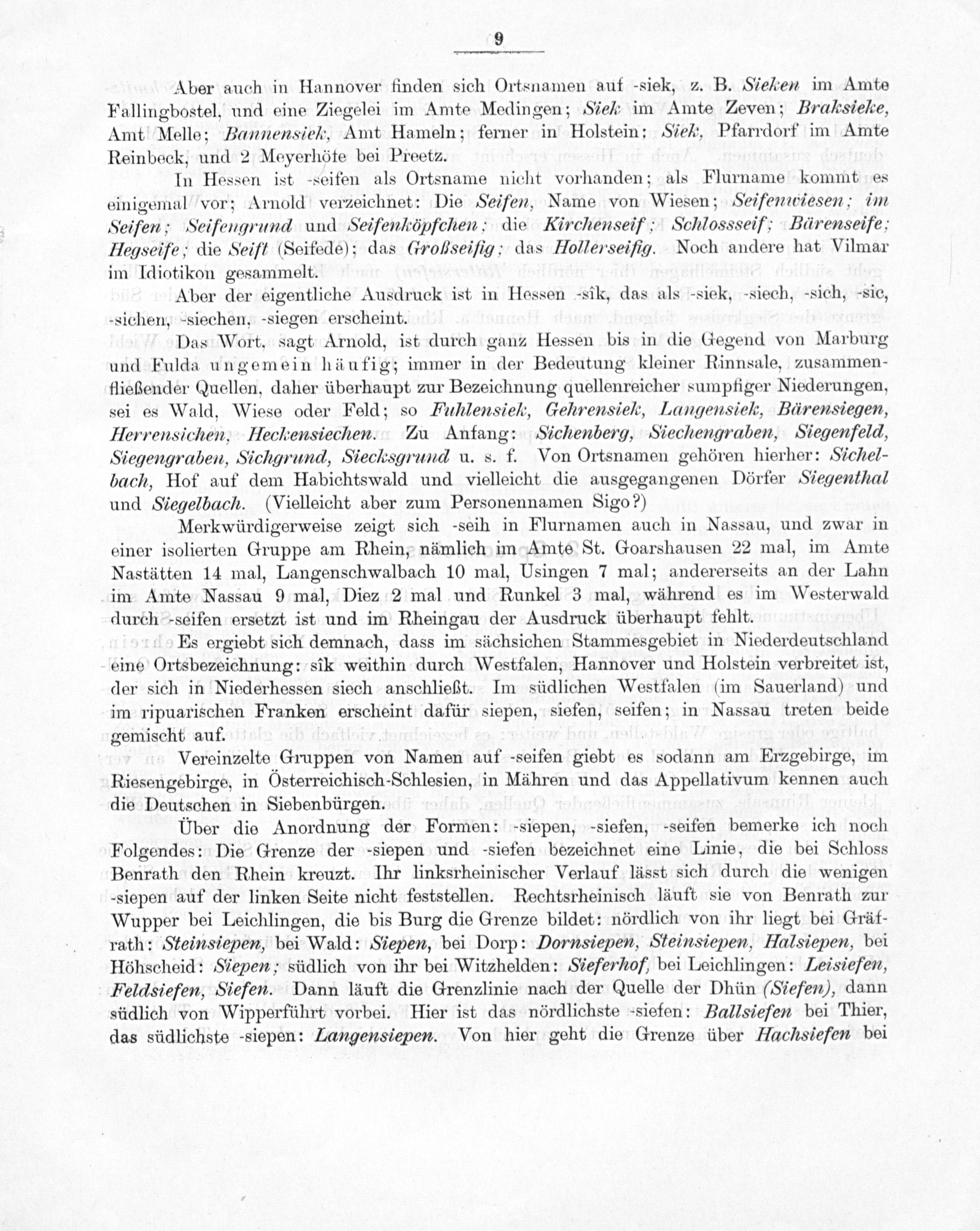 Es ergiebt sich demnach, dass im sächsichen Stammesgebiet in Niederdeutschland eine Ortsbezeichnung: sik weithin durch Westfalen, Hannover und Holstein verbreitet ist, der sich in Niederhessen siech anschließt. Im südlichen Westfalen(im Sauerland) und im ripuarischen Franken erscheint dafür siepen, siefen, seifen; in Nassau treten beide gemischt auf.—