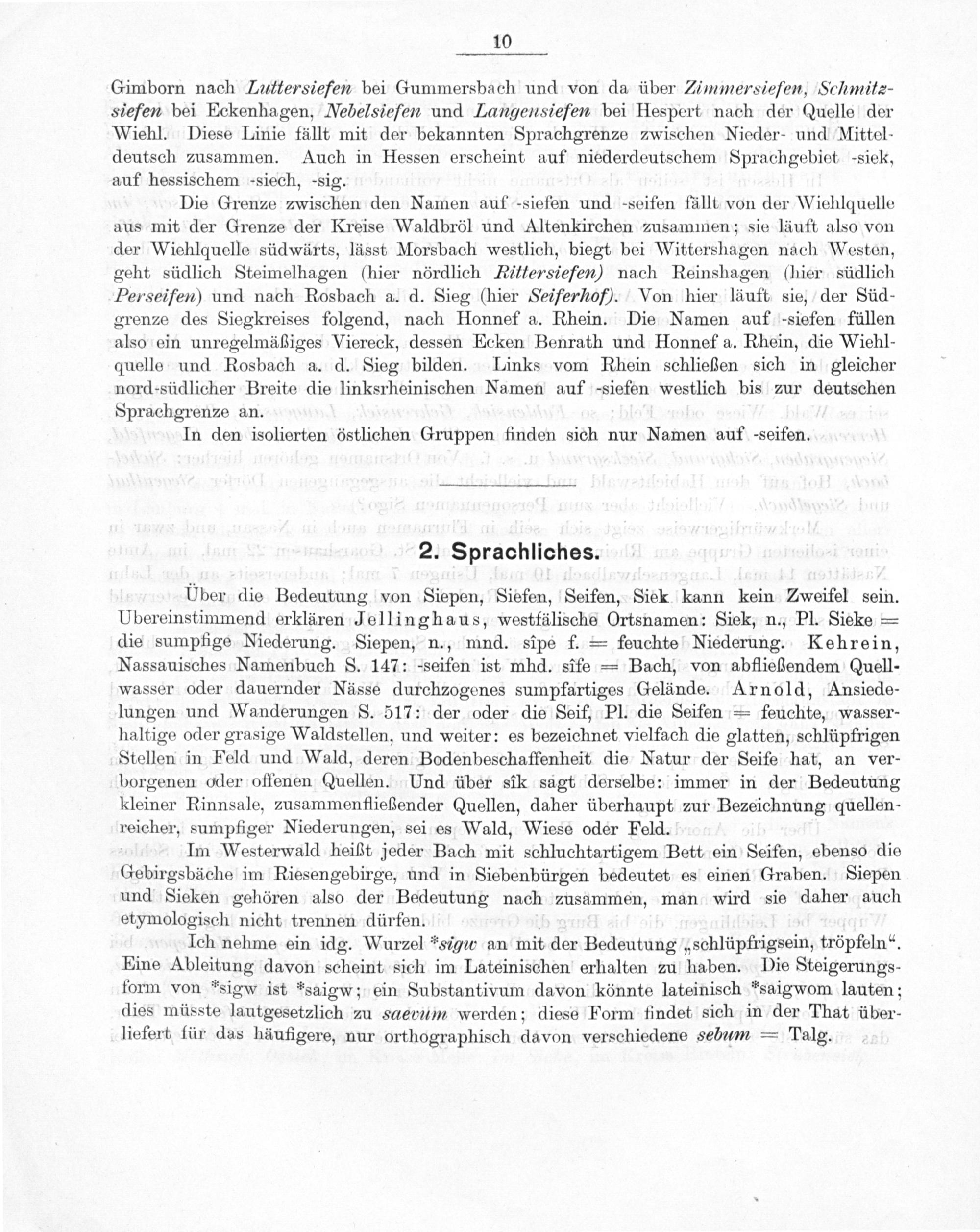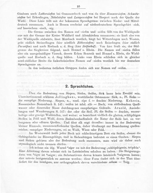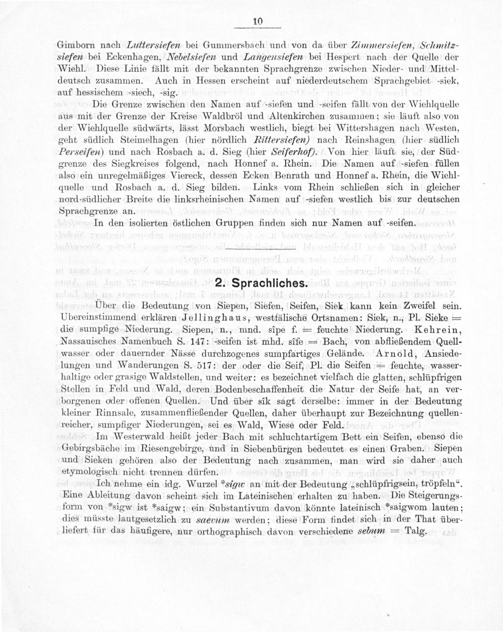Gimborn nach Luttersiefen bei Gummersbach und von da über Zimmerstefen, Schmitæe- siefen bei Eckenhagen, Nebelsiefen und Langensiefen bei Hespert nach der Quelle der Wiehl. Diese Linie fällt mit der bekannten Sprachgrenze zwischen Nieder- und Mittel- deutsch zusammen. Auch in Hessen erscheint auf niederdeutschem Sprachgebiet siek, auf hessischem siech, sig.