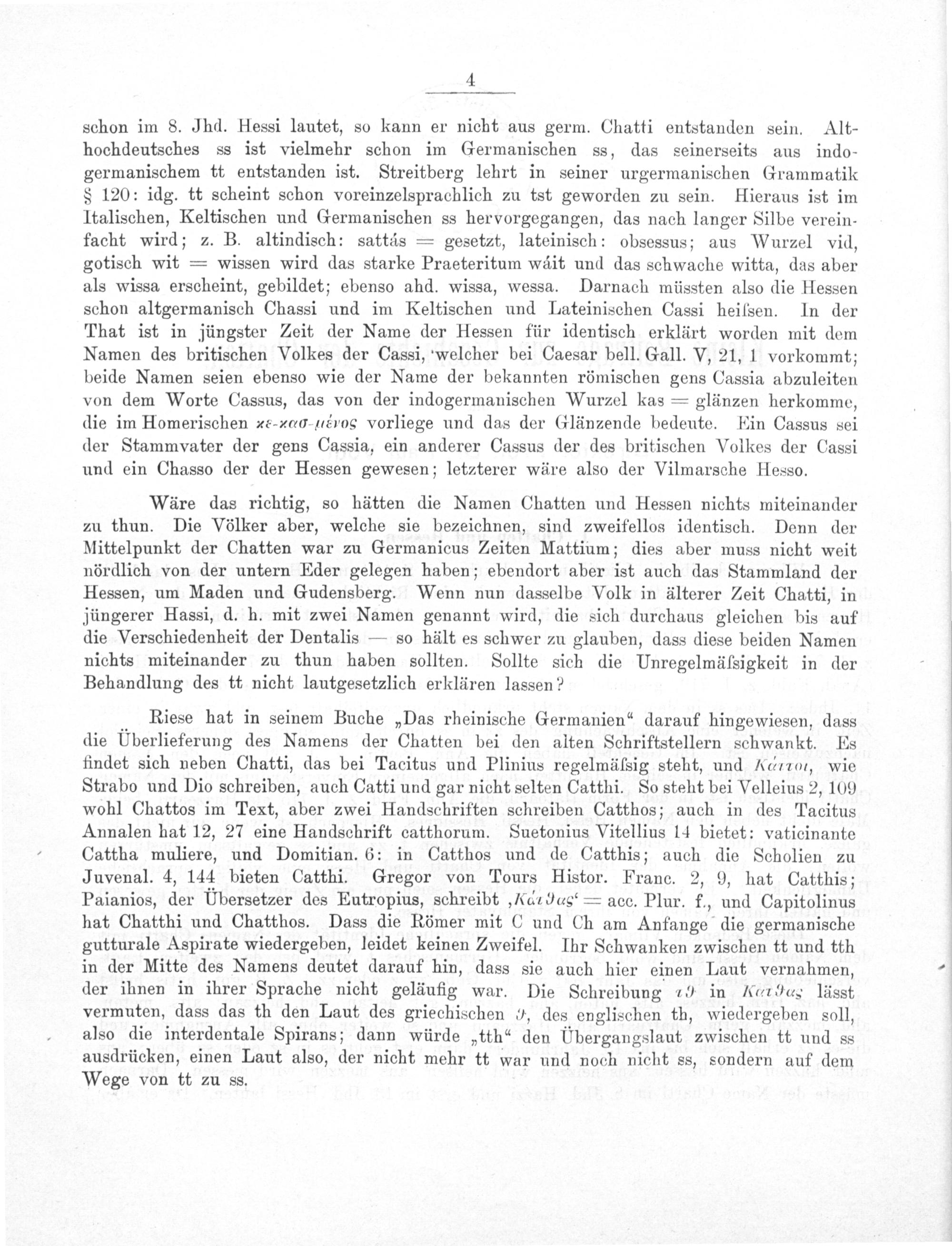 Riese hat in seinem Buche„Das rheinische Germanien“ darauf hingewiesen, dass die Überlieferung des Namens der Chatten bei den alten Schriftstellern schwankt. Es findet sich neben Chatti, das bei Tacitus und Plinius regelmälſsig steht, und Xęrτ, wie Strabo und Dio schreiben, auch Catti und gar nicht selten Catthi. So steht bei Velleius 2, 109 wohl Chattos im Text, aber zwei Handschriften schreiben Catthos; auch in des Tacitus Annalen hat 12, 27 eine Handschrift catthorum. Suetonius Vitellius 14 bietet: vaticinante Cattha muliere, und Domitian. 6: in Catthos und de Catthis; auch die Scholien zu Juvenal. 4, 144 bieten Catthi. Gregor von Tours Histor. Franc. 2, 9, hat Catthis; Paianios, der Übersetzer des Eutropius, schreibt ,X6νσςεέ acc. Plur. f., und Capitolinus hat Chatthi und Chatthos. Dass die Römer mit C und Ch am Anfange die germanische gutturale Aspirate wiedergeben, leidet keinen Zweifel. Ihr Schwanken zwischen tt und tth in der Mitte des Namens deutet darauf hin, dass sie auch hier einen Laut vernahmen, der ihnen in ihrer Sprache nicht geläufig war. Die Schreibung 19 in Karϑασς lässt vermuten, dass das th den Laut des griechischen 9, des englischen th, wiedergeben soll, also die interdentale Spirans; dann würde„tth“ den bergangslaut zwischen tt und ss ausdrücken, einen Laut also, der nicht mehr tt war und noch nicht ss, sondern auf dem Wege von tt zu ss.