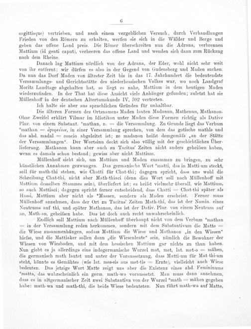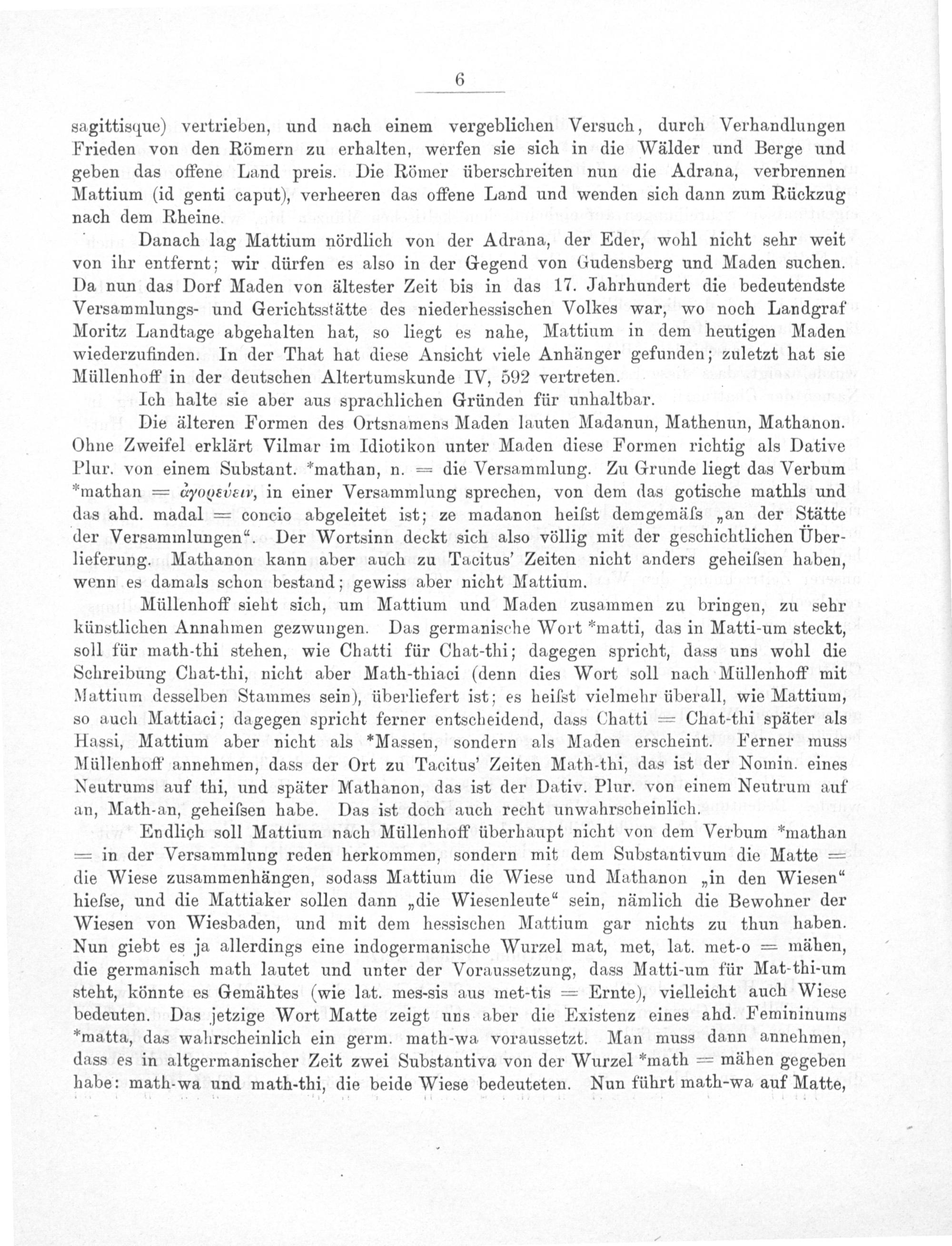 Müllenhoff sieht sich, um Mattium und Maden zusammen zu bringen, zu sehr künstlichen Annahmen gezwungen. Das germanische Wort*matti, das in Matti-um steckt, soll für math-thi stehen, wie Chatti für Chat-thi; dagegen spricht, dass uns wohl die Schreibung Chat-thi, nicht aber Math-thiaci(denn dies Wort soll nach Müllenhoff mit Mattium desselben Stammes sein), überliefert ist; es heiſst vielmehr überall, wie Mattium, so auch Mattiaci; dagegen spricht ferner entscheidend, dass Chatti= Chat-thi später als Hassi, Mattium aber nicht als*Massen, sondern als Maden erscheint. Ferner muss Müllenhoff annehmen, dass der Ort zu Tacitus' Zeiten Math-thi, das ist der Nomin. eines Neutrums auf thi, und später Mathanon, das ist der Dativ. Plur. von einem Neutrum auf an, Math-an, geheiſsen habe. Das ist doch auch recht unwahrscheinlich.