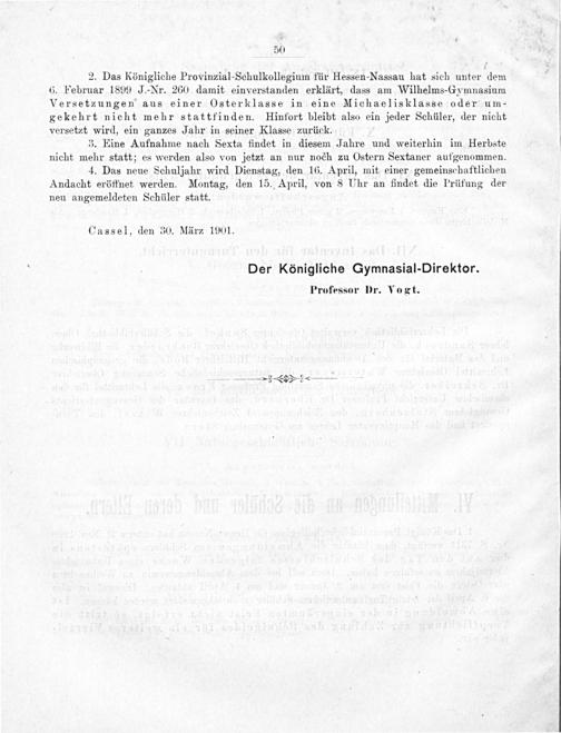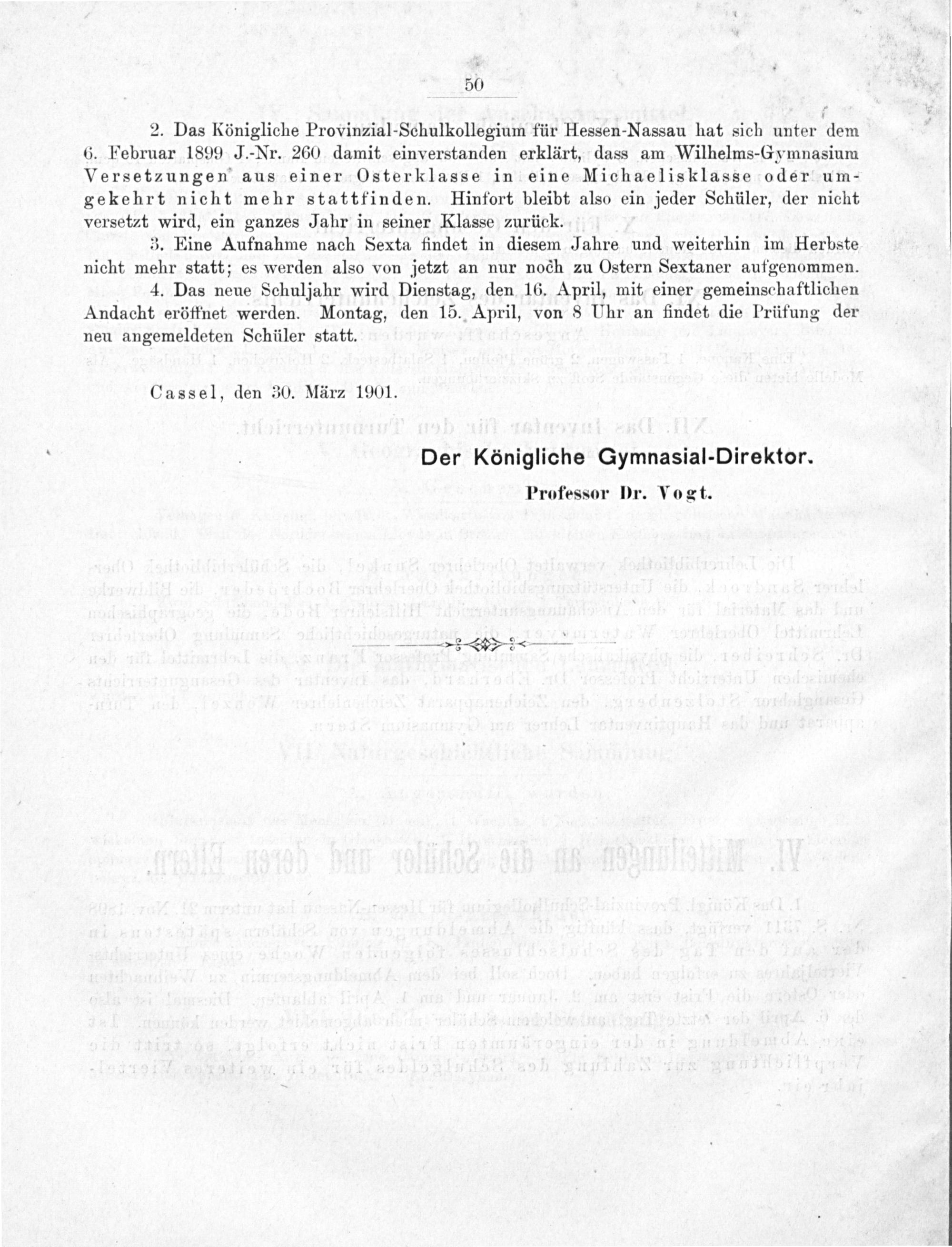 2. Das Königliche Provinzial-Schulkollegium für Hessen-Nassau hat sich unter dem 6. Februar 1899 J.-Nr. 260 damit einverstanden erklärt, dass am Wilhelms-Gymnasium Versetzungen aus einer Osterklasse in eine Michaelisklasse oder um- gekehrt nicht mehr stattfinden. Hinfort bleibt also ein jeder Schüler, der nicht versetzt wird, ein ganzes Jahr in seiner Klasse zurück.