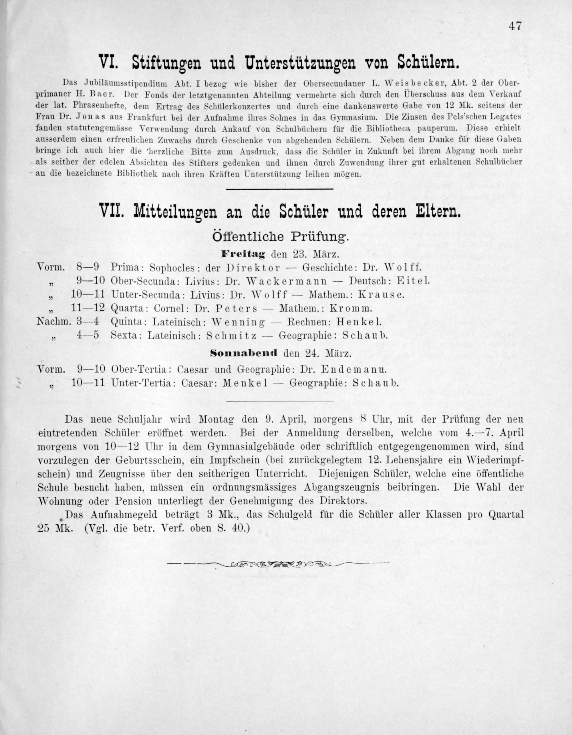 „Das Aufnahmegeld beträgt 3 Mk., das Schulgeld für die Schüler aller Klassen pro Quartal 25 Mk.(Vgl. die betr. Verf. oben S. 40.)
