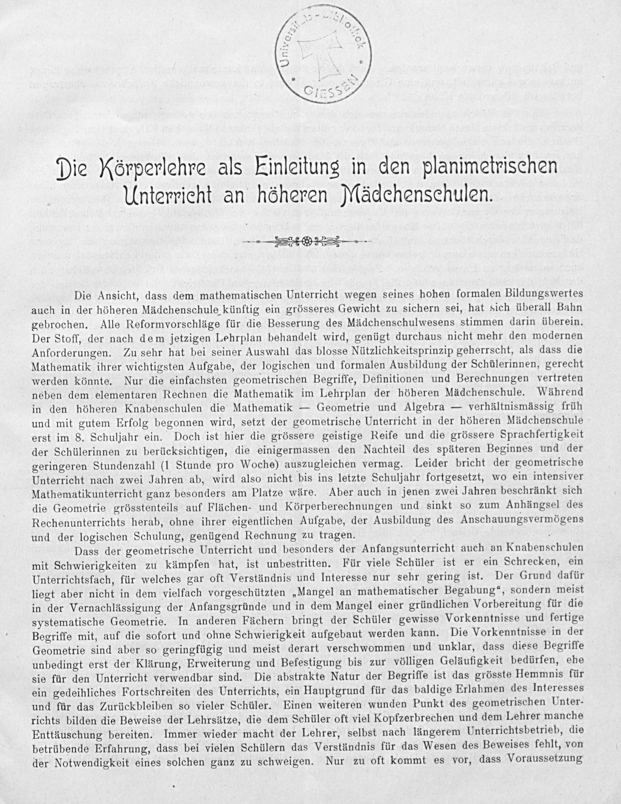 Die Rörperlehre als Einleitungs in den planimetrisehen Unterrieht an höheren Mädehenschulen.