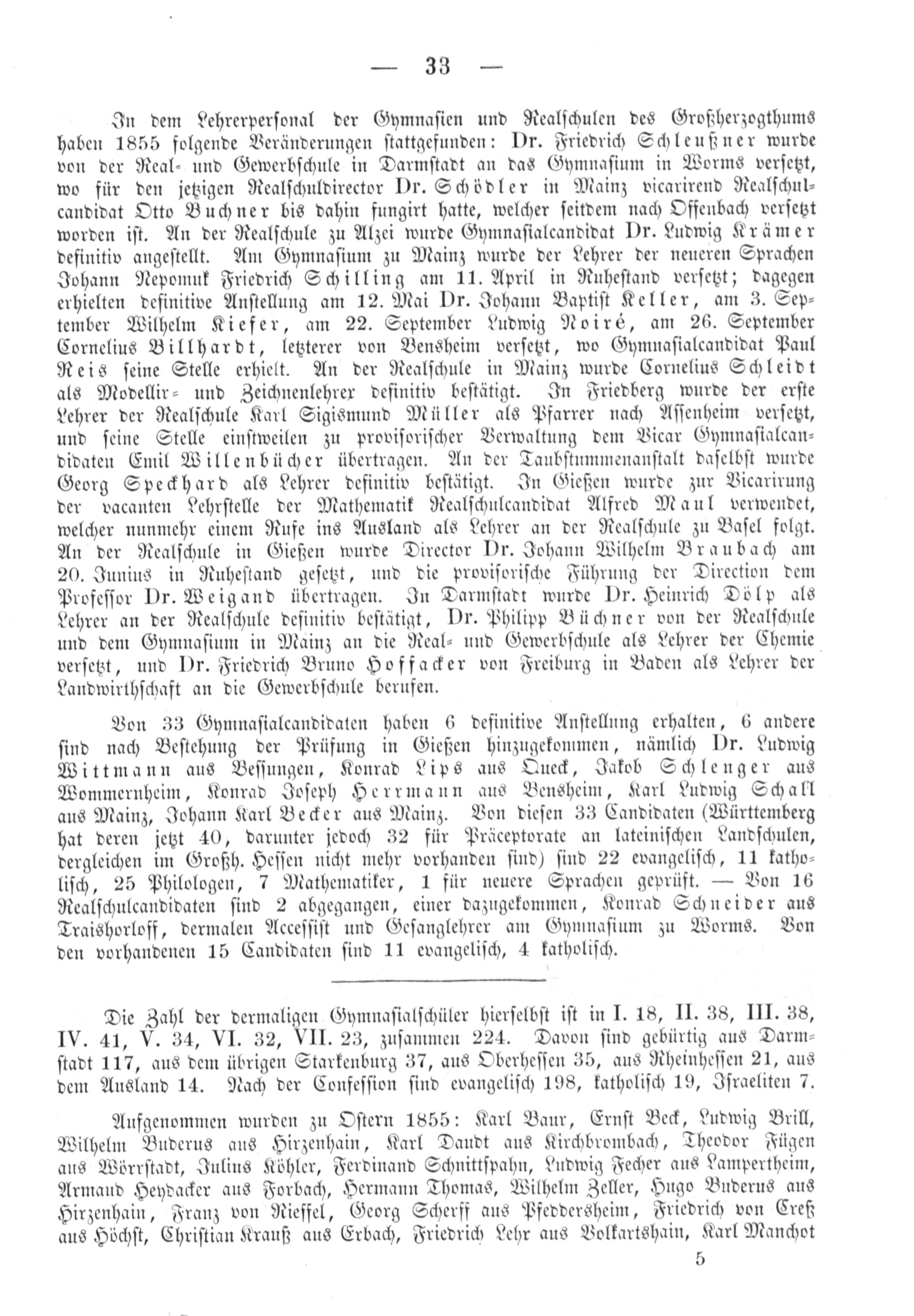 Aufgenommen wurden zu Oſtern 1855: Karl Baur, Ernſt Beck, Ludwig Brill, Wilhelm Buderus aus Hirzenhain, Karl Daudt aus Kirchbrombach, Theodor Fügen aus Wörrſtadt, Julius Köhler, Ferdinand Schnittſpahn, Ludwig Fecher aus Lampertheim, Armaud Heydacker aus Forbach, Hermann Thomas, Wilhelm Zeller, Hugo Buderus aus Hirzenhain, Franz von Rieffel, Georg Scherff aus Pfeddersheim, Friedrich von Creß aus Höchſt, Chriſtian Krauß aus Erbach, Friedrich Lehr aus Volkartshain, Karl Manchot