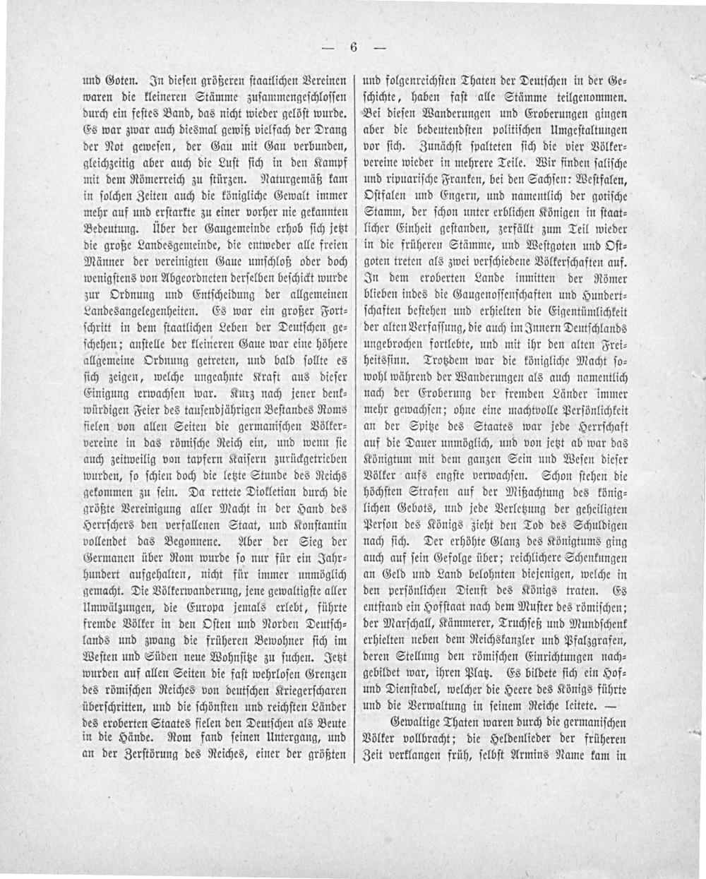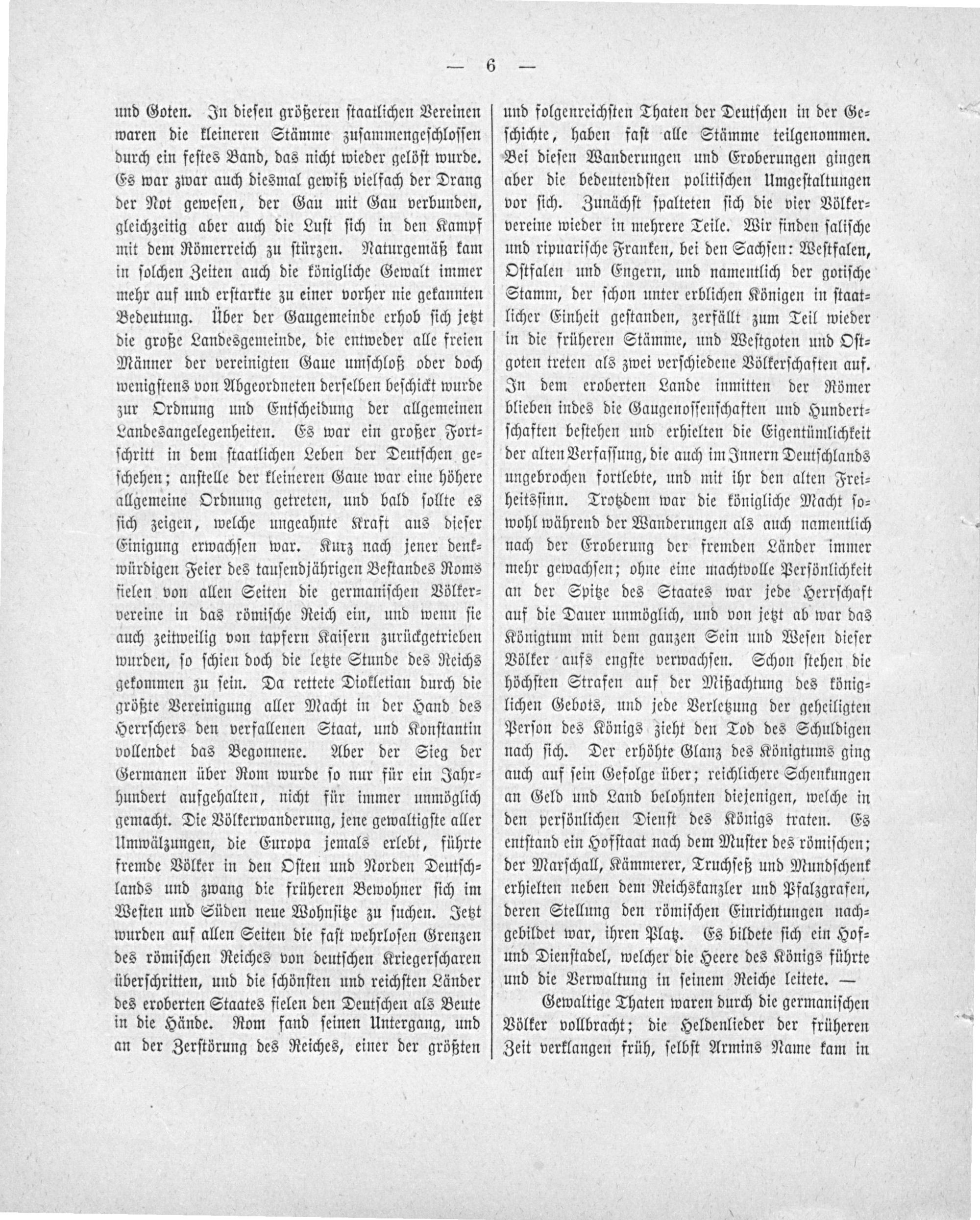 aber die bedeutendſten politiſchen Umgeſtaltungen vor ſich. Zunächſt ſpalteten ſich die vier Völker⸗ vereine wieder in mehrere Teile. Wir finden ſaliſche und ripuariſche Franken, bei den Sachſen: Weſtfalen, Oſtfalen und Engern, und namentlich der gotiſche Stamm, der ſchon unter erblichen Königen in ſtaat⸗ licher Einheit geſtanden, zerfällt zum Teil wieder in die früheren Stämme, und Weſtgoten und Oſt⸗ goten treten als zwei verſchiedene Völkerſchaften auf. In dem eroberten Lande inmitten der Römer blieben indes die Gaugenoſſenſchaften und Hundert⸗ ſchaften beſtehen und erhielten die Eigentümlichkeit der alten Verfaſſung, die auch im Innern Deutſchlands ungebrochen fortlebte, und mit ihr den alten Frei⸗ heitsſinn. Trotzdem war die königliche Macht ſo⸗ wohl während der Wanderungen als auch namentlich nach der Eroberung der fremden Länder immer mehr gewachſen; ohne eine machtvolle Perſönlichkeit an der Spitze des Staates war jede Herrſchaft auf die Dauer unmöglich, und von jetzt ab war das Königtum mit dem ganzen Sein und Weſen dieſer Völker aufs engſte verwachſen. Schon ſtehen die höchſten Strafen auf der Mißachtung des könig⸗ lichen Gebots, und jede Verletzung der geheiligten Perſon des Königs zieht den Tod des Schuldigen nach ſich. Der erhöhte Glanz des Königtums ging auch auf ſein Gefolge über; reichlichere Schenkungen an Geld und Land belohnten diejenigen, welche in den perſönlichen Dienſt des Königs traten. Es entſtand ein Hofſtaat nach dem Muſter des römiſchen; der Marſchall, Kämmerer, Truchſeß und Mundſchenk erhielten neben dem Reichskanzler und Pfalzgrafen, deren Stellung den römiſchen Einrichtungen nach⸗ gebildet war, ihren Platz. Es bildete ſich ein Hof⸗ und Dienſtadel, welcher die Heere des Königs führte und die Verwaltung in ſeinem Reiche leitete.— Gewaltige Thaten waren durch die germaniſchen Völker vollbracht; die Heldenlieder der früheren Zeit verklangen früh, ſelbſt Armins Name kam in