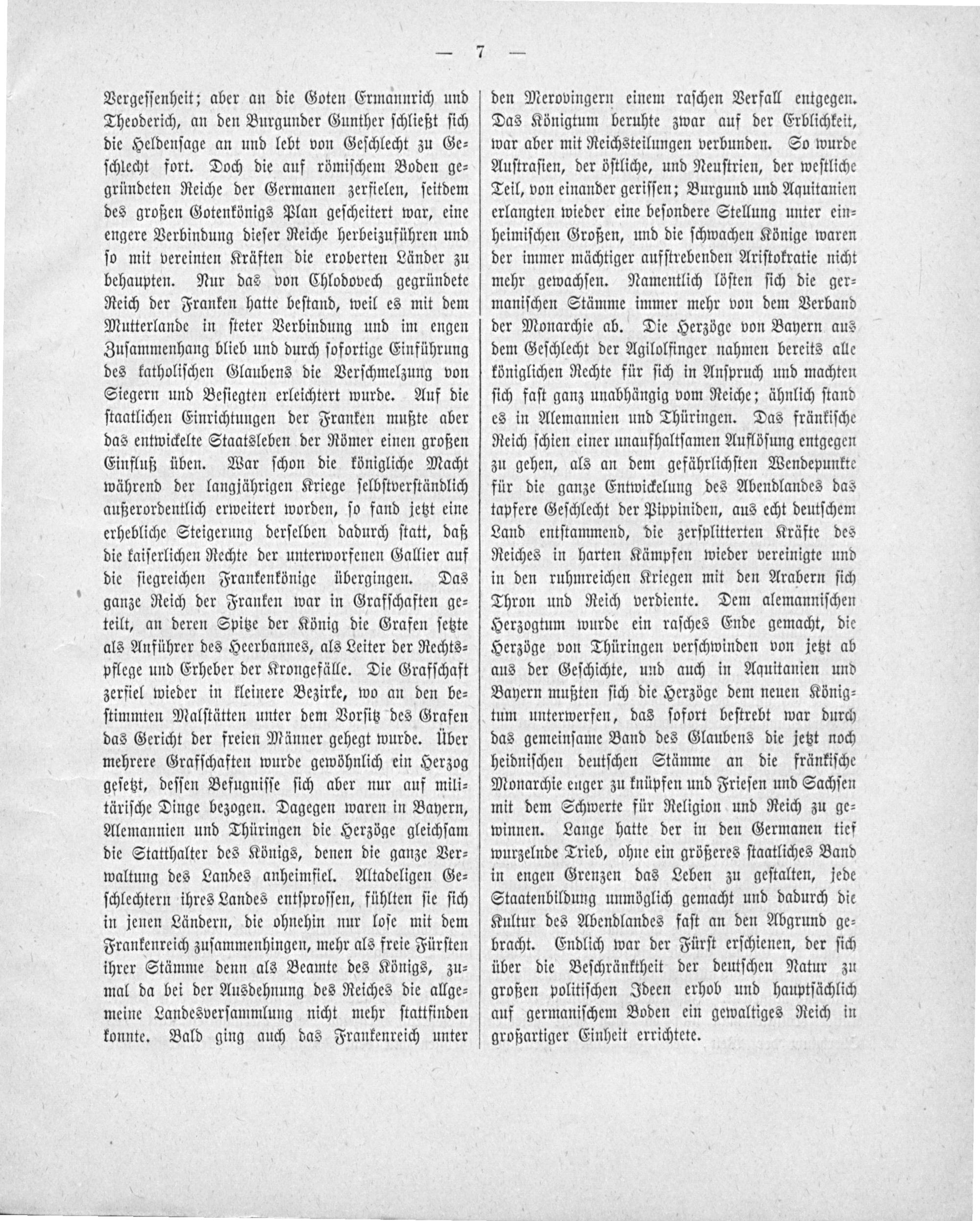 den Merovingern einem raſchen Verfall entgegen. Das Königtum beruhte zwar auf der Erblichkeit, war aber mit Reichsteilungen verbunden. So wurde Auſtraſien, der öſtliche, und Neuſtrien, der weſtliche Teil, von einander geriſſen; Burgund und Aquitanien erlangten wieder eine beſondere Stellung unter ein⸗ heimiſchen Großen, und die ſchwachen Könige waren der immer mächtiger aufſtrebenden Ariſtokratie nicht mehr gewachſen. Namentlich löſten ſich die ger⸗ maniſchen Stämme immer mehr von dem Verband der Monarchie ab. Die Herzöge von Bayern aus dem Geſchlecht der Agilolfinger nahmen bereits alle königlichen Rechte für ſich in Anſpruch und machten ſich faſt ganz unabhängig vom Reiche; ähnlich ſtand es in Alemannien und Thüringen. Das fränkiſche Reich ſchien einer unaufhaltſamen Auflöſung entgegen zu gehen, als an dem gefährlichſten Wendepunkte für die ganze Entwickelung des Abendlandes das tapfere Geſchlecht der Pippiniden, aus echt deutſchem Land entſtammend, die zerſplitterten Kräfte des Reiches in harten Kämpfen wieder vereinigte und in den ruhmreichen Kriegen mit den Arabern ſich Thron und Reich verdiente. Dem alemanniſchen Herzogtum wurde ein raſches Ende gemacht, die Herzöge von Thüringen verſchwinden von jetzt ab aus der Geſchichte, und auch in Aquitanien und Bayern mußten ſich die Herzöge dem neuen König⸗ tum unterwerfen, das ſofort beſtrebt war durch das gemeinſame Band des Glaubens die jetzt noch heidniſchen deutſchen Stämme an die fränkiſche Monarchie enger zu knüpfen und Frieſen und Sachſen mit dem Schwerte für Religion und Reich zu ge⸗ winnen. Lange hatte der in den Germanen tief wurzelnde Trieb, ohne ein größeres ſtaatliches Band in engen Grenzen das Leben zu geſtalten, jede Staatenbildung unmöglich gemacht und dadurch die Kultur des Abendlandes faſt an den Abgrund ge⸗ bracht. Endlich war der Fürſt erſchienen, der ſich über die Beſchränktheit der deutſchen Natur zu großen politiſchen Ideen erhob und hauptſächlich auf germaniſchem Boden ein gewaltiges Reich in großartiger Einheit errichtete.