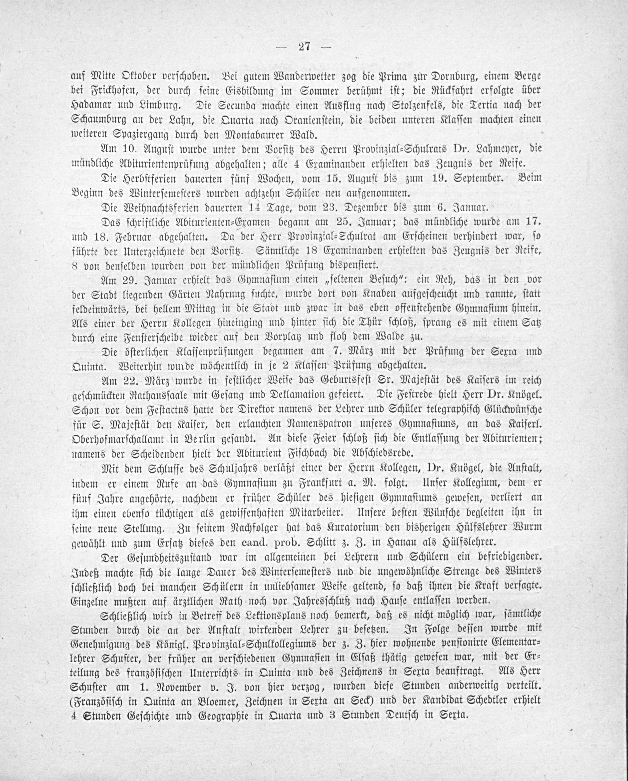 Das ſchriftliche Abiturienten⸗Examen begann am 25. Januar; das mündliche wurde am 17. und 18. Februar abgehalten. Da der Herr Provinzial⸗Schulrat am Erſcheinen verhindert war, ſo führte der Unterzeichnete den Vorſitz. Sämtliche 18 Examinanden erhielten das Zeugnis der Reife, 8 von denſelben wurden von der mündlichen Prüfung dispenſiert.