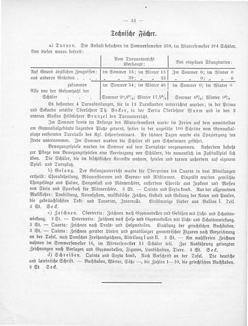 Im Sommer ſowie im Anfange des Winterſemeſters wurde im Freien auf dem unmittelbar am Gymnaſialgebäude liegenden Platze geturnt, ſpäter in der ungefähr 100 Schritte vom Gymnaſial⸗ platze entfernten Turnhalle des Kgl. Lehrerſeminars. An ſchönen Tagen wurde ein Spaziergang ins Freie unternommen. Im Sommer wurden die Schüler oft zum Schwimmen geführt.