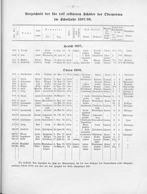 Dauer des 8 2*„.— Angabe 5. Ruf⸗ Geburts⸗ I. 5 ,2 Des Vaters der Nufeni halts Gewählter 2 22S Fin⸗ „ E. Name. 2=55 Ein⸗ am⸗ 3 8 name; Ort Tag ¹5 Stand Wohnort tritts⸗ faalt Prima Beruf. 6— g. V klaſſe. Jahre. Jahre. Herbſt 1397. 509 1 Dorſch Karl Klein⸗ 4. Nov. 75 22 kathol. Guts⸗ Deutſch⸗ Oberſ. 3 ½ 2 ½ Jura prießnitz beſitzer Eylau 4 510 2 Hoß Hans Warweiler 16. Juli 74 23„ † Poſt⸗ Warweiler Ober⸗ 1 3 ½ Medizin verwalter prima 5113 Müller Aloys Mayen 13. Nov. 76 20 ½„ Arzt Mayen Unterp. 2 ½ 2 ½ Medizin 512 4 Seyberth Ludwigſ Höchſt 10.April 78 18 ½ evang. Chemiker Höchſt Oberp.] 3½³½ 2 ½ Militärfach Oſtern 1393. 513/ 1 Bartholome Fritz Bochum 31 Mai 77 20 ½ kathol. Seminar⸗ Prüm Sexta 10 3 Theologie direktor 514 2 Beres Aloys Wörden([7. Aug 78 19 ½„ Kaufmann Wörden Quarta 7 2 Unbeſt. 515 3 Eſchenauer Rich. Wirges 18. Sep. 77 20 ½„„ Wirges Untert. 6 2 Philologie 516 4 Franz Otto Caſſel 30. Jan. 78 20„ Lehrer Caſſel Unterp. 2 2 Mathem. 517 5 Gatzen Wilh. Aachen 8. Aug. 79 18 ½2„ Juſtizrat Aachen Oberſ. 2 ½ 2 Marinefach 518 6 Geis Martin Villmar 21. Jan. 76 22„ Steinhauer Villmar Quarta 7 2 Theologie 519 7 Görg Peter Hartenfels 27. Sept. 78 19 ½„ Landmann Hartenfels Untert. 6 2 TLheolog. u. Philologie 520 ʃ8 Graef Jakob Obertiefen⸗ 26. März75 23„ ¼ Land⸗ Obertiefen⸗ Unterp. 3 3 ETheologie bach mann bach 521 9 Haas Adam Montabaurſ8. Aug. 78 191 2„ Metzger Montabaur Sexta 10 2„ 522 10 Hannappel Jakob. 14. Mai 76 21 ⁄½ 5 Bäcker„„ 12 2 Medizin 523 11 Heimen Jakob Oberheim⸗ 10. Nov. 76 21 ½„ Kaufmann Oberheim⸗ Quarta 7 2 Tuyheologie bach bach 524 /12 Hommerich Karl Selters 18. Mai 79 18 ½2„ Kreis⸗ Montabaur Untert. 6 2 Medizin phyſikus 525 13 Hottenroth Valent. Johannis⸗ 21. Okt. 78 19 ½„ Bürger⸗ Johannis⸗„ 6 2 Philologie berg meiſter berg 526[14 Hülsmann Heinr. Warendorf 5. Nov. 76 21 ½„ Auktions⸗Warendorf Quinta 8 2 Jura kommiſſar 52715 Jung Karl Lorch 17. Mai 78 19 ½„ Wein⸗ Lorch Quarta 7 2 Theologie händler 528 16 Landers Herm. Flörsheim 30. Juni 78 19 ½„[† Poſt⸗ Flörsheim Quinta 8 2 Chemie verwalter 529/17 Mainz Heinr. Stotzheim 8. Okt. 77 2012„ Landmann Vallendar Serta 9 2 Tuheologie 530/18 Ungeheuer Joh. Wirges 23. Jan. 75 23„ † Lehrer Wicker Quarta 8 3 4 53119 Veidt Karl Dörnberg 20. Febr.79 19 evang. Lehrer Langen⸗ Untert. 5 ½ 2„ ſcheid 532 20 Wagſchal Ferdin. Montabaur 4. Aug. 79 18 ½ ſiſraelit. Lehrer(Montabaur Sexrta 9 2„ 533/˙21 Wiltz Nikol. Waller⸗ 13. März73 25 ſkathol. Land⸗ Waller⸗ Oberſ. 2 ½ 2„ fangen mann fangen