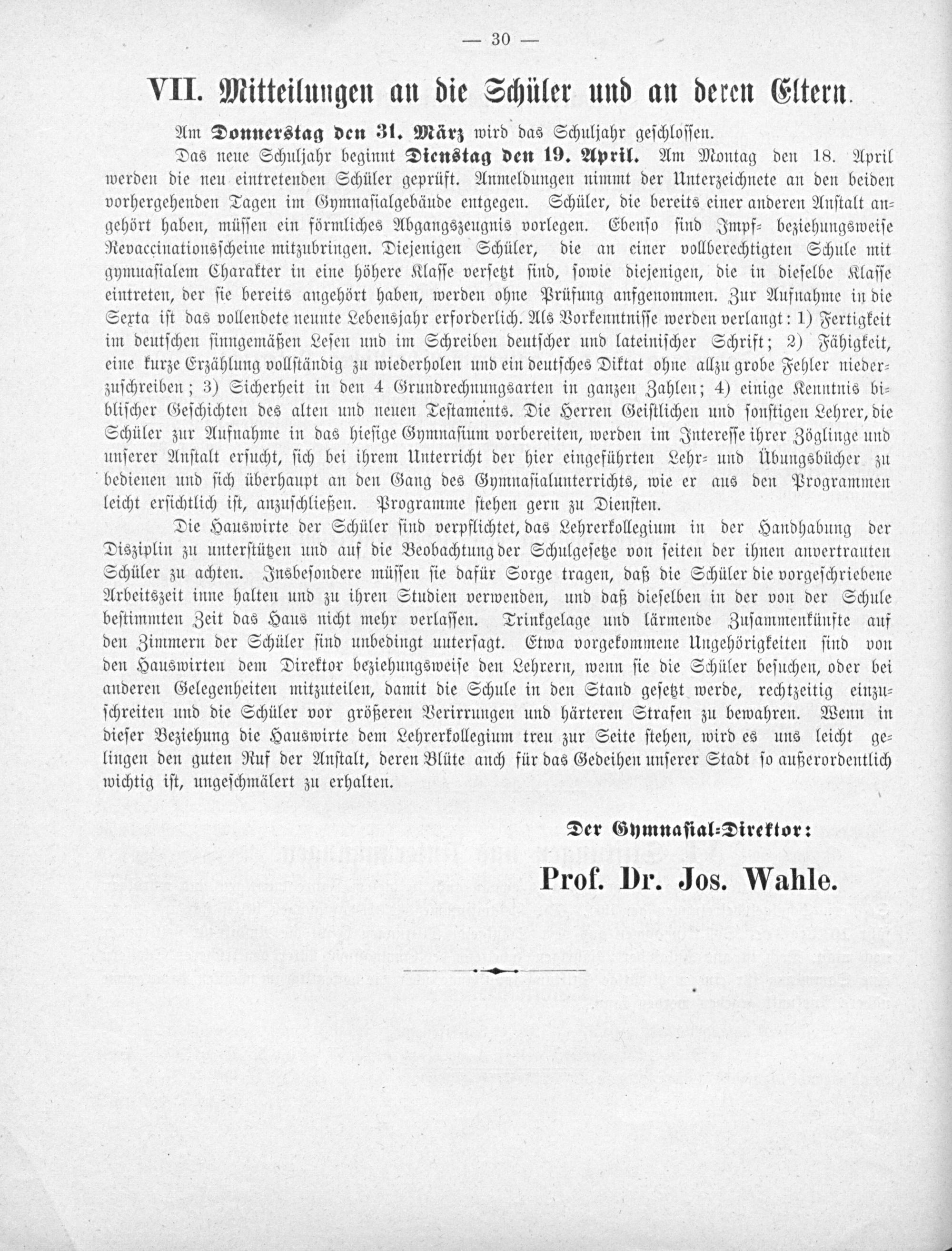 Das neue Schuljahr beginnt Dienstag den 19. April. Am Montag den 18. April werden die neu eintretenden Schüler geprüft. Anmeldungen nimmt der Unterzeichnete an den beiden vorhergehenden Tagen im Gymnaſialgebäude entgegen. Schüler, die bereits einer anderen Anſtalt an⸗ gehört haben, müſſen ein förmliches Abgangszeugnis vorlegen. Ebenſo ſind Impf⸗ beziehungsweiſe Revaccinationsſcheine mitzubringen. Diejenigen Schüler, die an einer vollberechtigten Schule mit gymuaſialem Charakter in eine höhere Klaſſe verſetzt ſind, ſowie diejenigen, die in dieſelbe Klaſſe eintreten, der ſie bereits angehört haben, werden ohne Prüfung anfgenommen. Zur Aufnahme in die Sexta iſt das vollendete neunte Lebensjahr erforderlich. Als Vorkenntniſſe werden verlangt: 1) Fertigkeit im deutſchen ſinngemäßen Leſen und im Schreiben deutſcher und lateiniſcher Schrift; 2) Fähigkeit, eine kurze Erzählung vollſtändig zu wiederholen und ein deutſches Diktat ohne allzu grobe Fehler nieder⸗ zuſchreiben; 3) Sicherheit in den 4 Grundrechnungsarten in ganzen Zahlen; 4) einige Kenntnis bi⸗ bliſcher Geſchichten des alten und neuen Teſtaments. Die Herren Geiſtlichen und ſonſtigen Lehrer, die Schüler zur Aufnahme in das hieſige Gymnaſium vorbereiten, werden im Intereſſe ihrer Zöglinge und unſerer Anſtalt erſucht, ſich bei ihrem Unterricht der hier eingeführten Lehr⸗ und Übungsbücher zu bedienen und ſich überhaupt an den Gang des Gymnaſialunterrichts, wie er aus den Programmen leicht erſichtlich iſt, anzuſchließen. Programme ſtehen gern zu Dienſten.