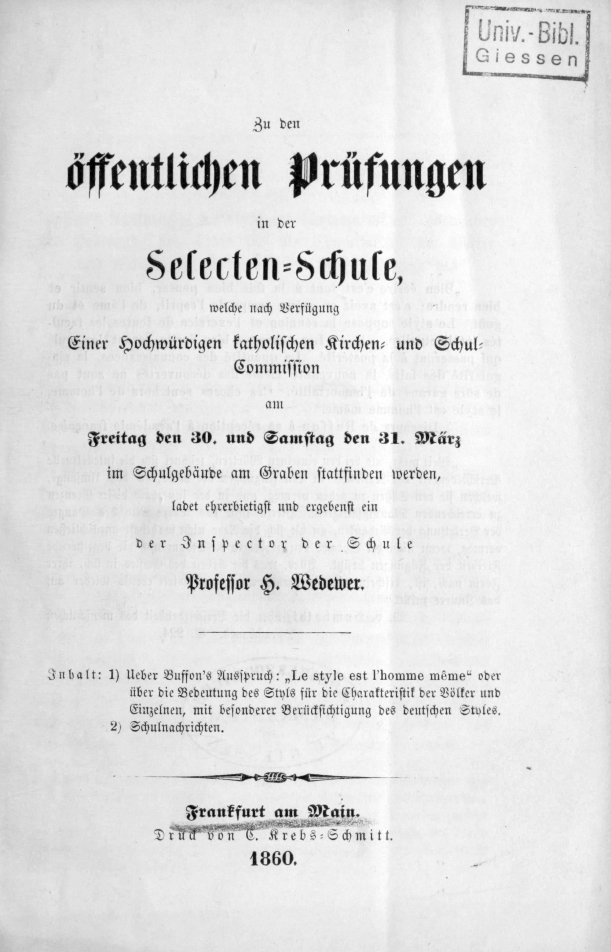 Inbalt: 1) Ueber Buffon's Ausſpruch:„Le style est l'homme même“ oder über die Bedeutung des Styls für die Charakteriſtik der Völker und Einzelnen, mit beſonderer Berückſichtigung des deutſchen Styles.