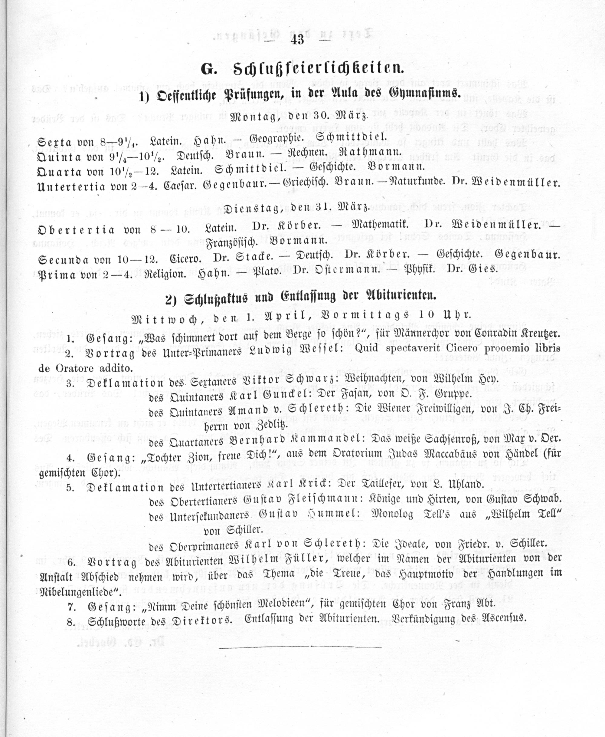 6. Vortrag des Abiturienten Wilhelm Füller, welcher im Namen der Abiturienten von der Anſtalt Abſchied nehmen wird, über das Thema„die Treue, das Hauptmotiv der Handlungen im Nibelungenliede“.