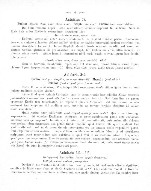 Aulularia 312— 313. duinſ gquom ipsi pridem tonsor unguis dempserat, Collegit, omnia abstulit præsegmina. Duplex in his versibus inest difficultas. Nam primum, id quod uncis adiectis significavi, omnibus in libris quom abest et ab O. Seyfferto(Phil. XXV 442) additum recepit G. Goœtzius. Præterea sententiae multum inter se discedunt, quo modo alterius versus duo illa membra inter-