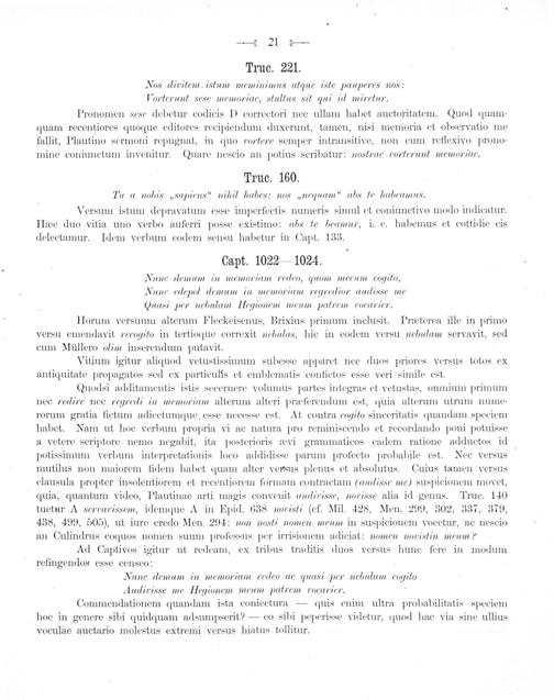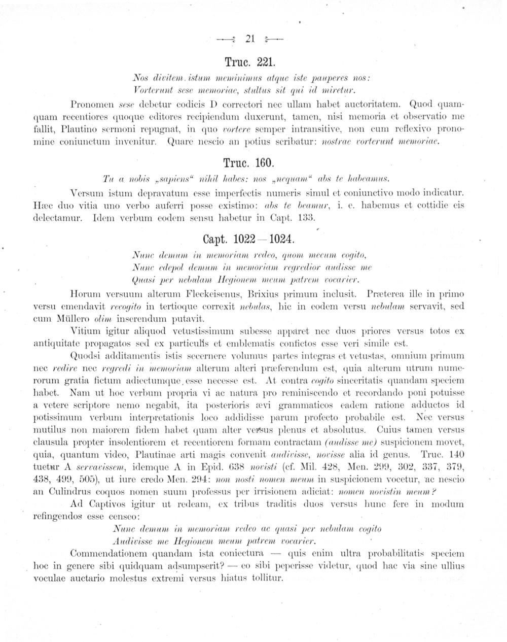Quodsi additamentis istis secernere volumus partes integras et vetustas, omnium primum nec redire nec regredi in memoriam alterum alteri prœferendum est, quia alterum utrum nume- rorum gratia fictum adiectumque esse necesse est. At contra cogito sinceritatis quandam speciem habet. Nam ut hoc verbum propria vi ac natura pro reminiscendo et recordando poni potuisse a vetere scriptore nemo negabit, ita posterioris œvi grammaticos eadem ratione adductos id potissimum verbum interpretationis loco addidisse parum profecto probabile est. Nec versus mutilus non maiorem fidem habet quam alter versus plenus et absolutus. Cuius tamen versus clausula propter insolentiorem et recentiorem formam contractam(audisse me) suspicionem movet, quia, quantum video, Plautinae arti magis convenit audivisse, novisse alia id genus. Truc. 140 tuetur A serravissem, idemque A in Epid. 638 novisti(cf. Mil. 428, Men. 299, 302, 337, 379, 438, 499, 505), ut iure credo Men. 294: non nosti nomen meum in suspicionem vocetur, ac nescio an Culindrus coquos nomen suum professus per irrisionem adiciat: nomen noristin meum?