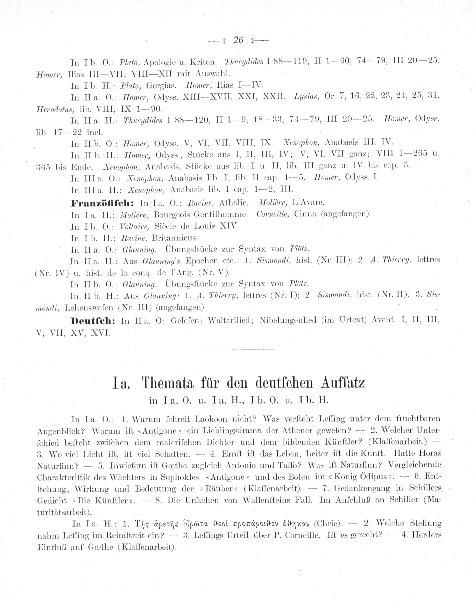 In Ib. O.: Plato, Apologie u. Kriton. Thucydides I 88— 119, II 1—60, 74— 79, III 20— 25. Homer, Ilias II— VII; VIII— XII mit Auswahl.