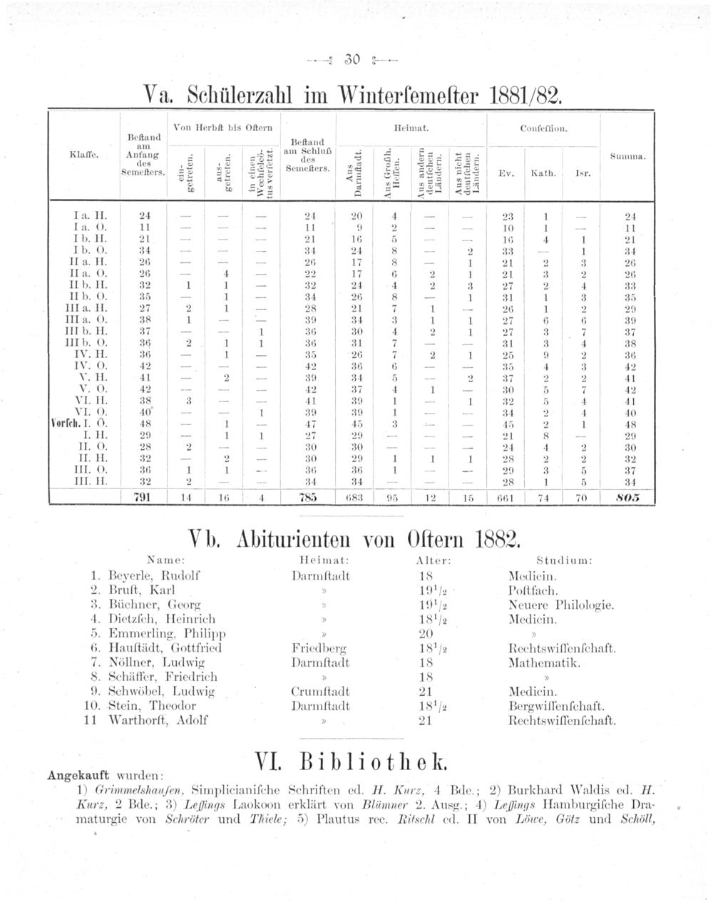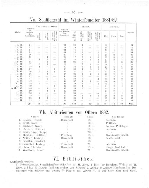 Von Herbſt bis Oſtern Heimat. Confeflion. Beſtand am Begand 1 Klaffe. Anfang 2 2 3 8 am Zod 15 3 2. 5 25s Summa. des 22 ½ν— Semeſters. 24 25 22 5 22 Semeſters. 2 2 22 2=s Seme 325 5E 28 2S82 Ev. Kath. Isr. —— 5 2 5 22S —— 2 235n 5: 8 8 2 4 2* 2 734 Ta. II 24——— 24 20— 23 1— 24 Ia. O0. 11——— 11 9 2— 10 1— 11 I b. II. 21——— 21 16 5— 16 1 1 21 I b. 0O 34—— 34 24 8— 2 33— 1 34 II a. II 26-——— 22 17 8— 1 21 2 3 26 II a. 0 26— 4— 22 17 6 2 1 21 3 2 26 II b. II 32 1 1— 32 24 4 2 3 27 2 4 33 II b. 0 35— 1— 34 26 8— 1 31 1 3 35 III a. II. 27 2 1— 28 21 7 1— 26 1 2 29 III a. 0 38 1—— 39 34 3 1 1 27 6 6 39 III b. II 37—— 1 36 30 4 2 1 27 3 7 37 III b. O0 36 2 1 1 36 31 7—— 31 3 4 38 IV. II 36— 1— 35 26 7 2 1 25 9 2 36 IV. O. 42——— 42 36 6—— 35 4 3 42 V. II. 41— 2— 39 34 5— 2 37 2 2 41 V. O. 42——— 42 37 4 1— 30 5 7 42 VI. II. 38 3—— 41 39 1— 1 32 5 4 41 VI. 0. 40—— 1 39 39 1—— 34 2 1 40 Vorſch. I. O. 48 3 1— 47 45 3— 45 2 1 48 I. II. 29— 1 1 27 29—.— 21 8— 29 II. O 28 2—— 30 30——— 24 4 2 30 II. II 32— 2— 30 29 1 1 1 28 2 2 32 III. O 36 1 1— 36 36 1—— 29 3 5 37 III H 32 34 34—— 28 1 5 34 791 14 16 4 785 683 95 12 15 661 74 70 805 *.* 6 Vb. Abiturienten von Oſtern 1882. Name: Heimat: AIter: Studium: 1. Beyerle, Rudolf Darmſtadt 18 Medicin. 2. Bruſt, Karl„ 19 ½ Poſtfach. 3. Büchner, Georg 19 ½ Neuere Philologie. 4. Dietzſch, Heinrich„ 18 ½ Medicin. 5. Emmerling, Philipp„ 20„ 6. Hauſtädt, Gottfried FrieOdberg 18 ½ Rechtswiffenſchaft. 7. Nöllner, Ludwig Darmſtadt 18 Mathematik. 8. Schäffer, Friedrich„ 18„ 9. Schwöbel, Ludwig Crumſtadt 21 Medicin. 10. Stein, Theodor Darmſtadt. 18 ½ Bergwiffenſchaft. 11 Warthorſt, Adolf„ 21 Rechtswiffenſchaft.
