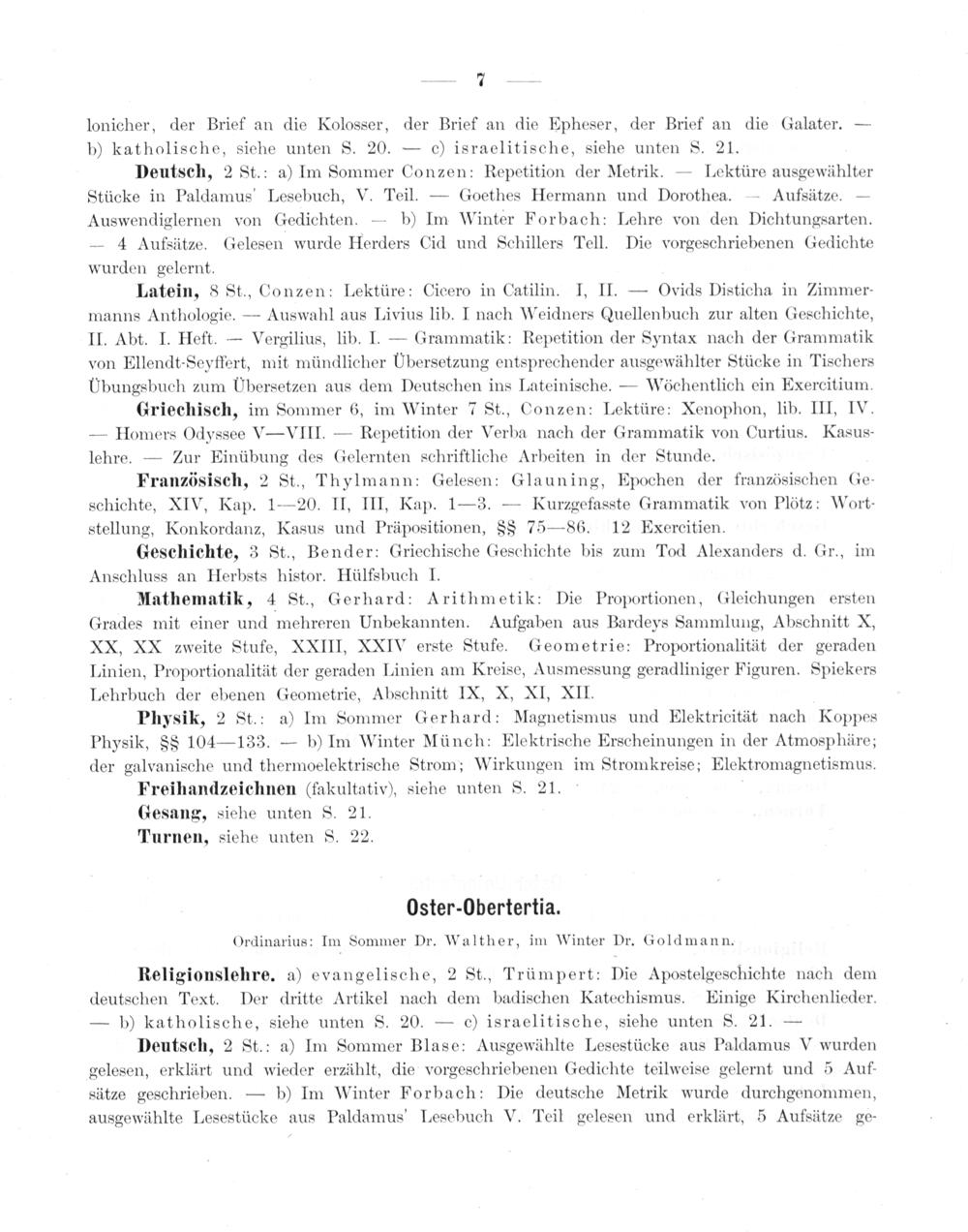 Deutsch, 2 St.: a) Im Sommer Conzen: Repetition der Metrik.— Lektüre ausgewählter Stücke in Paldamus’ Lesebuch, V. Teil.— Goethes Hermann und Dorothea.— Aufsätze.— Auswendiglernen von Gedichten.— b) Im Winter Forbach: Lehre von den Dichtungsarten. — 4 Aufsätze. Gelesen wurde Herders Cid und Schillers Tell. Die vorgeschriebenen Gedichte wurden gelernt.