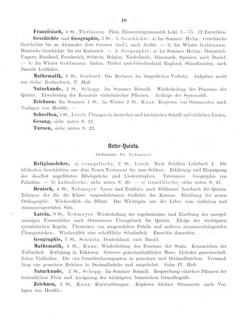Latein, 9 St., Nehmeyer: Wiederholung der regelmässigen und Einübung der unregel- mässigen Formenlehre nach Ostermanns UÜbungsbuch für Quinta. Einige der wichtigsten syntaktischen Regeln. Übersetzen von ausgewählten Fabeln und anderen zusammenhängenden Ubungsstücken. Wöchentlirh eine schriftliche Schularbeit. Exercitia domestica.