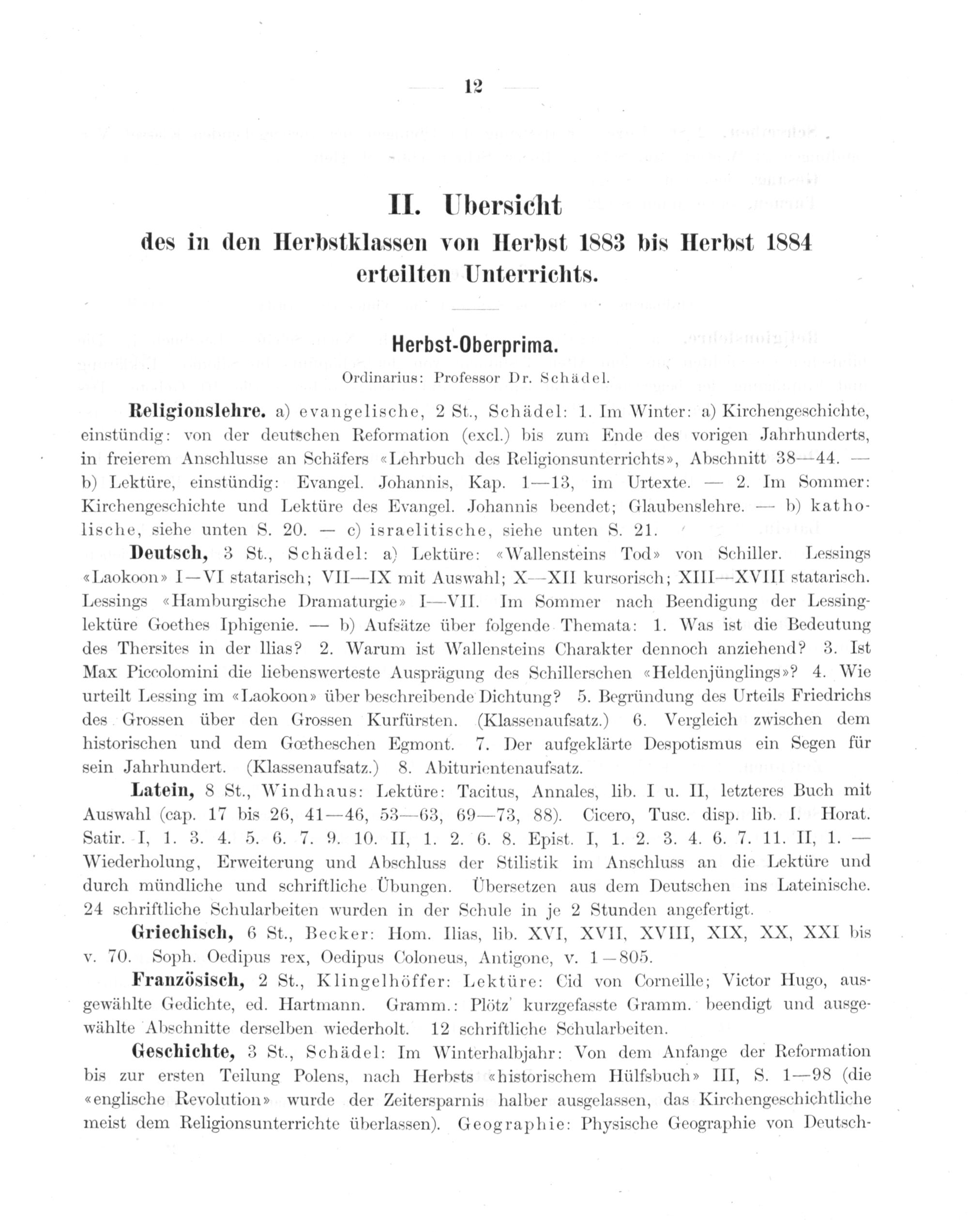 Latein, 8 St., Windhaus: Lektüre: Tacitus, Annales, lib. I u. II, letzteres Buch mit Auswahl(cap. 17 bis 26, 41— 46, 53— 63, 69—73, 88). Cicero, Tusc. disp. lib. I. Horat. Satir. I, 1. 3. 4. 5. 6. 7. 9. 10. II, 1. 2. 6. 8. Epist. I, 1. 2. 3. 4. 6. 7. 11. II, 1.— Wiederholung, Erweiterung und Abschluss der Stilistik im Anschluss an die Lektüre und durch mündliche und schriftliche UÜbungen. Übersetzen aus dem Deutschen ins Lateinische. 24 schriftliche Schularbeiten wurden in der Schule in je 2 Stunden angefertigt.