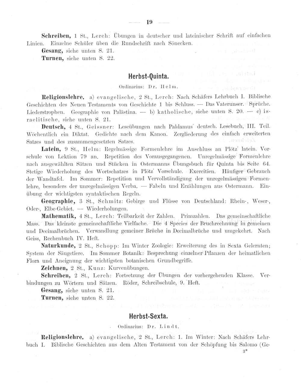 Latein, 9 St., Helm: Regelmässige Formenlehre im Anschluss an Plötz’ latein. Vor- schule von Lektion 79 an. Repetition des Vorausgegangenen. Unregelmässige Formenlehre nach ausgewählten Sätzen und Stücken in Ostermanns UÜbungsbuch für Quinta bis Seite 64. Stetige Wiederholung des Wortschatzes in Plötz Vorschule. Exercitien. Häufiger Gebrauch der Wandtafel. Im Sommer: Repetition und Vervollständigung der unregelmässigen Formen- lehre, besonders der unregelmässigen Verba.— Fabeln und Erzühlungen aus Ostermann. Ein- übung der wichtigsten syntaktischen Regeln.