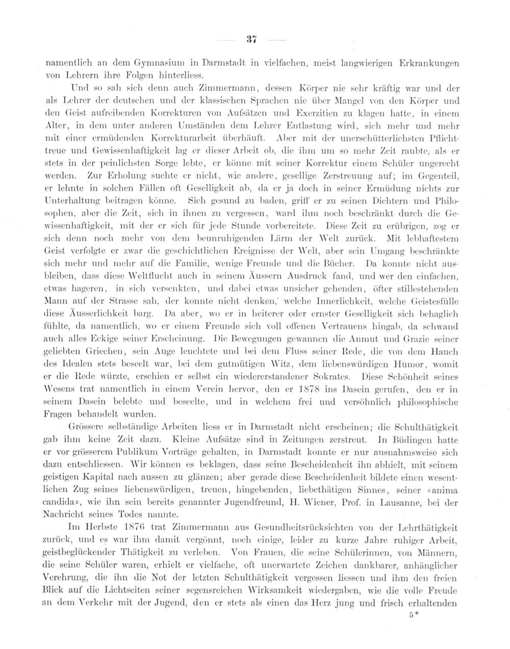 Und so sah sich denn auch Zimmermann, dessen Körper nie sehr kräftig war und der als Lehrer der deutschen und der klassischen Sprachen nie über Mangel von den Körper und den Geist aufreibenden Korrekturen von Aufsätzen und Exerzitien zu klagen hatte, in einem Alter, in dem unter anderen Umständen dem Lehrer Entlastung wird, sich mehr und mehr mit einer ermüdenden Korrekturarbeit überhäuft. Aber mit der unerschütterlichsten Pflicht- treue und Gewissenhaftigkeit lag er dieser Arbeit ob, die ihm um so mehr Zeit raubte, als er stets in der peinlichsten Sorge lebte, er könne mit seiner Korrektur einem Schüler ungerecht werden. Zur Erholung suchte er nicht, wie andere, gesellige Zerstreuung auf; im Gegenteil, er lehnte in solchen Fällen oft Geselligkeit ab, da er ja doch in seiner Ermüdung nichts zur Unterhaltung beitragen könne. Sich gesund zu baden, griff er zu seinen Dichtern und Philo- sophen, aber die Zeit, sich in ihnen zu vergessen, ward ihm noch beschränkt durch die Ge- wissenhaftigkeit, mit der er sich für jede Stunde vorbereitete. Diese Zeit zu erübrigen, zog er sich denn noch mehr von dem beunruhigenden Lärm der Welt zurück. Mit lebhaftestem Geist verfolgte er zwar die geschichtlichen Ereignisse der Welt, aber sein Umgang beschränkte sich mehr und mehr auf die Familie, wenige Freunde und die Bücher. Da konnte nicht aus- pleiben, dass diese Weltflucht auch in seinem Xussern Ausdruck fand, und wer den einfachen, etwas hageren, in sich versenkten, und dabei etwas unsicher gehenden, öfter stillestehenden Mann auf der Strasse sah, der konnte nicht denken, welche Innerlichkeit, welche Geistesfülle diese Kusserlichkeit barg. Da aber, wo er in heiterer oder ernster Geselligkeit sich behaglich fühlte, da namentlich, wo er einem Freunde sich voll offenen Vertrauens hingab, da schwand auch alles Eckige seiner Erscheinung. Die Bewegungen gewannen die Anmut und Grazie seiner geliebten Griechen, sein Auge leuchtete und bei dem Fluss seiner Rede, die von dem Hauch des Idealen stets bescelt war, bei dem gutmütigen Witz, dem liebenswürdigen Humor, womit er die Rede würzte, erschien er selbst ein wiedererstandener Sokrates. Diese Schönheit seines Wesens trat namentlich in einem Verein hervor, den er 1878 ins Dasein gerufen, den er in seinem Dasein belebte und beseelte, und in welchem frei und versöhnlich philosophische Fragen behandelt wurden.