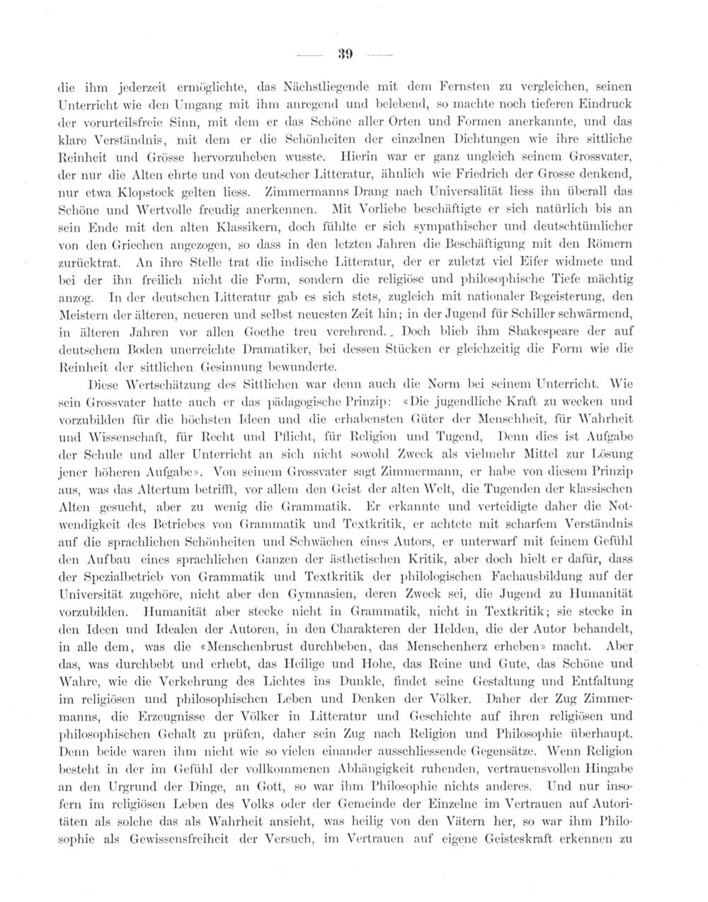 die ihm jederzeit ermöglichte, das Nächstliegende mit dem Fernsten zu vergleichen, seinen Unterricht wie den Umgang mit ihm anregend und belebend, so machte noch tieferen Eindruck der vorurteilsfreie Sinn, mit dem er das Schöne aller Orten und Formen anerkannte, und das klare Verständnis, mit dem er die Schönheiten der einzelnen Dichtungen wie ihre sittliche Reinheit und Grösse hervorzuheben wusste. Hierin war er ganz ungleich seinem Grossvater, der nur die Alten ehrte und von deutscher Litteratur, ähnlich wie Friedrich der Grosse denkend, nur etwa Klopstock gelten liess. Zimmermanns Drang nach Universalität liess ihn überall das Schöne und Wertvolle freudig anerkennen. Mit Vorliebe beschäftigte er sich natürlich bis an sein Ende mit den alten Klassikern, doch fühlte er sich sympathischer und deutschtümlicher von den Griechen angezogen, so dass in den letzten Jahren die Beschäftigung mit den Römern zurücktrat. An ihre Stelle trat die indische Litteratur, der er zuletzt viel Eifer widmete und bei der ihn freilich nicht die Form, sondern die religiöse und philosophische Tiefe mächtig anzog. In der deutschen Litteratur gab es sich stets, zugleich mit nationaler Begeisterung, den Meistern der älteren, neueren und selbst neuesten Zeit hin; in der Jugend für Schiller schwärmend, in älteren Jahren vor allen Goethe treu verehrend.. Doch blieb ihm Shakespeare der auf deutschem Boden unerreichte Dramatiker, bei dessen Stücken er gleichzeitig die Form wie die Reinheit der sittlichen Gesinnung bewunderte.