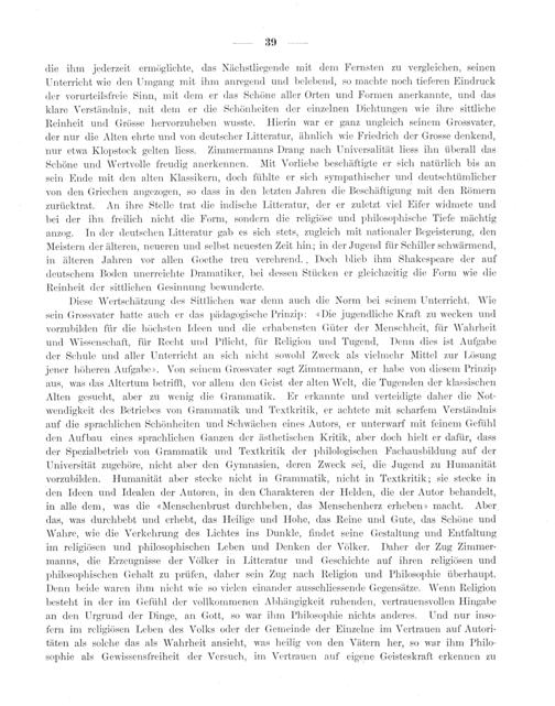 Diese Wertschätzung des Sittlichen war denn auch die Norm bei seinem Unterricht. Wie sein Grossvater hatte auch er das pädagogische Prinzip: Die jugendliche Kraft zu wecken und vorzubilden für die höchsten Ideen und die erhabensten Güter der Menschheit, für Wahrheit, und Wissenschaft, für Recht und Pflicht, für Religion und Tugend, Denn dies ist Aufgabe der Schule und aller Unterricht an sich nicht sowohl Zweck als vielmehr Mittel zur Lösung jener höheren Aufgabe». Von seinem Grossvater sagt Zimmermann, er habe von diesem Prinzip aus, was das Altertum betrifft, vor allem den Geist der alten Welt, die Tugenden der klassischen Alten gesucht, aber zu wenig die Grammatik. Er erkannte und verteidigte daher die Not- wendigkeit des Betriebes von Grammatik und Textkritik, er achtete mit scharfem Verständnis auf die sprachlichen Schönheiten und Schwäüchen eines Autors, er unterwarf mit feinem Gefühl den Aufbau eines sprachlichen Ganzen der ästhetischen Kritik, aber doch hielt er dafür, dass der Spezialbetrieb von Grammatik und Textkritik der philologischen Fachausbildung auf der Universität zugehöre, nicht aber den Gymnasien, deren Zweck sei, die Jugend zu Humanität vorzubilden. Humanität aber stecke nicht in Grammatik, nicht in Textkritik; sie stecke in den Ideen und Idealen der Autoren, in den Charakteren der Helden, die der Autor behandelt, in alle dem, was die«Menschenbrust durchbeben, das Menschenherz erheben» macht. Aber das, was durchbebt und erhebt, das Heilige und Hohe, das Reine und Gute, das Schöne und Wahre, wie die Verkehrung des Lichtes ins Dunkle, findet seine Gestaltung und Entfaltung im religiösen und philosophischen Leben und Denken der Völker. Daher der Zug Zimmer- manns, die Erzeugnisse der Völker in Litteratur und Geschichte auf ihren religiösen und philosophischen Gehalt zu prüfen, daher sein Zug nach Religion und Philosophie überhaupt. Denn beide waren ihm nicht wie so vielen einander ausschliessende Gegensätze. Wenn Religion besteht in der im Gefühl der vollkommenen Abhängigkeit ruhenden, vertrauensvollen Hingabe an den Urgrund der Dinge, an Gott, so war ihm Philosophie nichts anderes. Und nur inso-— fern im religiösen Leben des Volks oder der Gemeinde der Einzelne im Vertrauen auf Autori- täten als solche das als Wahrheit ansieht, was heilig von den Vätern her, so war ihm Philo- sophie als Gewissensfreiheit der Versuch, im Vertrauen auf eigene Geisteskraft erkennen zu