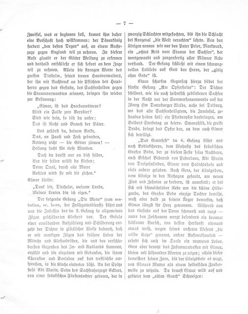 „Das Erntefeſt“ im 6. Geſang führt uns nach Bodinkthorpe, dem Wohnſitz des fränkiſchen Grafen Bodo, der zu dieſem Feſte ſeine Nachbarn, auch Biſchof Badurad von Paderborn, Abt Warin von Dreizehnlinden, Elmar vom Habichtshofe und viele andere geladen. Auch Gero, der Königsbote, vom Könige in den Nethegau geſandt, um neuen Zins und Zehnten zu fordern, iſt anweſend; er hat ſich mit ſchmeichelnder Rede um die ſchöne Hilde⸗ gunde, des Grafen Bodo einzige Tochter bemüht, muß aber bald zu ſeinem ÄArger bemerken, daß Elmar längſt ihr Herz gewonnen. Während nun das Geſinde auf der Tenne ſchmauſt und tanzt— unter den Zuſchauern erregt beſonders ein brauner ſeltſamer Burſch, von deſſen Herkunft niemand etwas weiß, wegen ſeines unſteten Weſens„die wilde Katze“ genannt, unſere Aufmerkſamkeit— erhebt ſich auch im Saale ein munteres Leben. Gero aber benutzt das Zuſammentreffen mit Elmar, dieſen mit höhnenden Worten zu reizen; allein dieſer bemeiſtert ſeinen Zorn, bis der Königsbote es wagt, von Elmars Mutter als einem heidniſchen Zauber⸗ weibe zu witzeln. Da brauſt Elmar wild auf und gebietet dem„eitlen Gauch“ Schweigen: