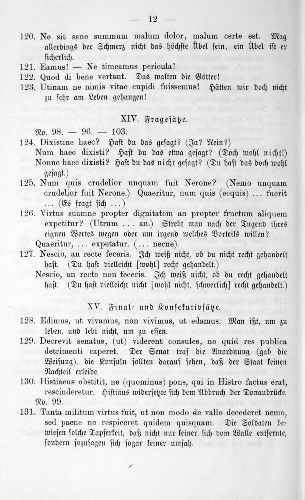 XIV. Frageſätze. No. 98.— 96.— 103. 124. Dixistine haec? Haſt du das geſagt?(Ja? Nein?) Num haec dixisti? Haſt du das etwa geſagt?(Doch wohl nicht!) Nonne haec dixisti? Haſt du das nicht geſagt?(Du haſt das doch wohl