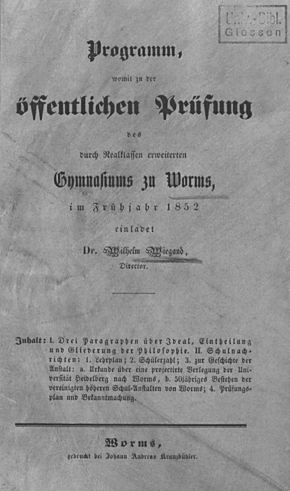 Inhalt: l. Drei Paragraphen über Ideal, Eintheilung und Gliederung der Philoſophie. II. Schulnach⸗ richten: 1. Lehrplan; 2. Schülerzahl; 3. zur Geſchichte der Anſtalt: a. Urkunde über eine projectirte Verlegung der Uni⸗ verſität Heidelberg nach Worms, b. 50 jähriges Beſtehen der vereinigten höheren Schul⸗Anſtalten von Worms; 4. Prüfungs⸗ plan und Bekanntmachung.
