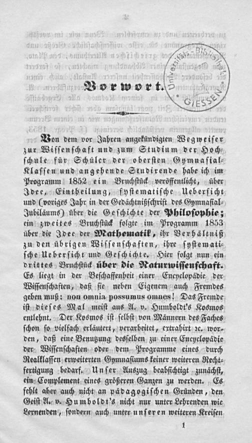 Von dem vor Jahren angekündigten Wegweiſer zur Wiſſenſchaft und zum Studium der Hoch⸗ ſchule für Schüler der oberſten Gymnaſial⸗ Klaſſen und angehende Studirende habe ich im Programm 1852 ein Bruchſtück veröffentlicht, über Idee, Eintheilung, fyſtematiſche Ueberſicht und(voriges Jahr in der Gedächtnißſchrift des Gymnaſial⸗ Jubiläums) über die Geſchichte der Philoſophie; ein zweites Bruchſtück folgte im Programm 1853 über die Idee der Mathematik, ihr Verhältniß zu den übrigen Wiſſenſchaften, ihre ſyſtemati⸗ ſche Ueberſicht und Geſchichte. Hier folgt nun ein drittes Bruchſtück über die Naturwiſſenſehaft. Es liegt in der Beſchaffenheit einer Encyclopädie der Wiſſenſchaften, daß ſie neben Eigenem auch Fremdes geben muß: non omnia possumus omnes! Das Fremde iſt dieſes Mal meiſt aus A. v. Humboldt's Kosmos entlehnt. Der Kosmos iſt ſelbſt von Männern des Faches ſchon ſo vielfach erläutert, verarbeitet, extrahirt zc. wor⸗ den, daß eine Benutzung desſelben zu einer Encyrlopädie der Wiſſenſchaften oder dem Programme eines durch Realklaſſen erweiterten Gymnaſiums keiner weiteren Recht⸗ fertigung bedarf. Unſer Auszug beabſichtigt zunächſt, ein Complement eines größeren Ganzen zu werden. Es fehlt abey auch nicht an pädagogiſchen Gründen, den Geiſt A. v. Humboldt's nicht nur unter Lehrenden wie Lernenden, ſondern auch unter unſeren weiteren Kreiſen