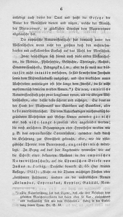 Zwar beſchäftigen ſich hiemit auch viele andre Wiſſenſchaf⸗ ten, die Medicin, Philoſophie, Geſchichte, Theologie, Rechts⸗, Staatswiſſenſchaft, Pädagogik u. ſ. w., aber da ſie meiſt nur dis⸗ curſiv nicht intuitiv verfahren, ſo ſind ſie mehr dem Irrthum ſowie dem Mißverſtändniſſe ausgeſetzt, und ihre wirklichen neuen Wahrheiten unterliegen oft ſehr lange dem Zweifel, da ſie nicht mathematiſch bewieſen werden können.*) Die neue, empiriſche Naturwiſſenſchaft geht zwar langſamer voran, als die übrigen Wiſ⸗ ſenſchaften, aber dafür deſto ſicherer und richtiger. Sie baut an der Hand der Mathematik nur Sandkorn auf Sandkorn, aber deſto unerſchütterlicher. Die vom Naturkundigen mathematiſch be⸗ gründeten Wahrheiten und Geſetze können entweder gar nicht oder doch nicht lange bezweifelt oder angefeindet werden; die noch unſicheren Behauptungen oder Hypotheſen werden wie z. B. das copernikaniſche Sonnenſyſtem, entweder bald durch die Erfahrung zur Gewißheit gebracht, oder, wie die phlo⸗ giſtiſche Theorie vom Brennproceß, augenſcheinlich wider⸗ legt. In Bezug auf das hier Angedeutete verweiſen wir auf die Schrift eines bekannten Meiſters in der empiriſchen Naturwiſſenſchaft, auf die Chemiſchen Briefe von Juſtus v. Liebig. Derſelbe bemerkt S. 65(der dritten Auflage, 1851):„Nicht an die Thaten mächtiger Fürſten oder „berühmter Feldherrn, ſondern an die unſterblichen Namen „Columbus, Copernikus, Keppler, Galilas, New⸗